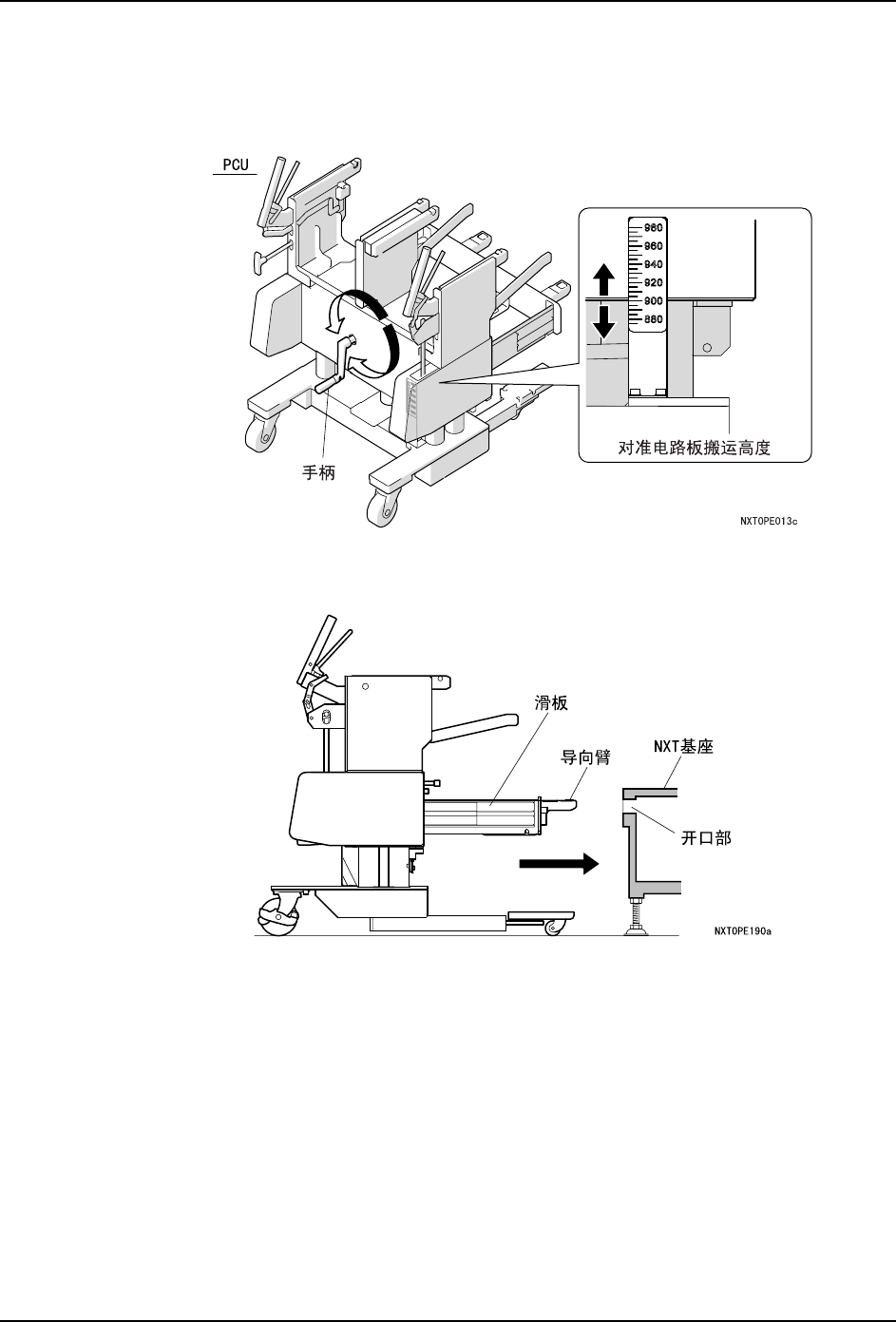 1. 准备 PCU。旋转手柄使 PCU 上下移动,请确认刻度使之对准机器的电路板搬运高度。