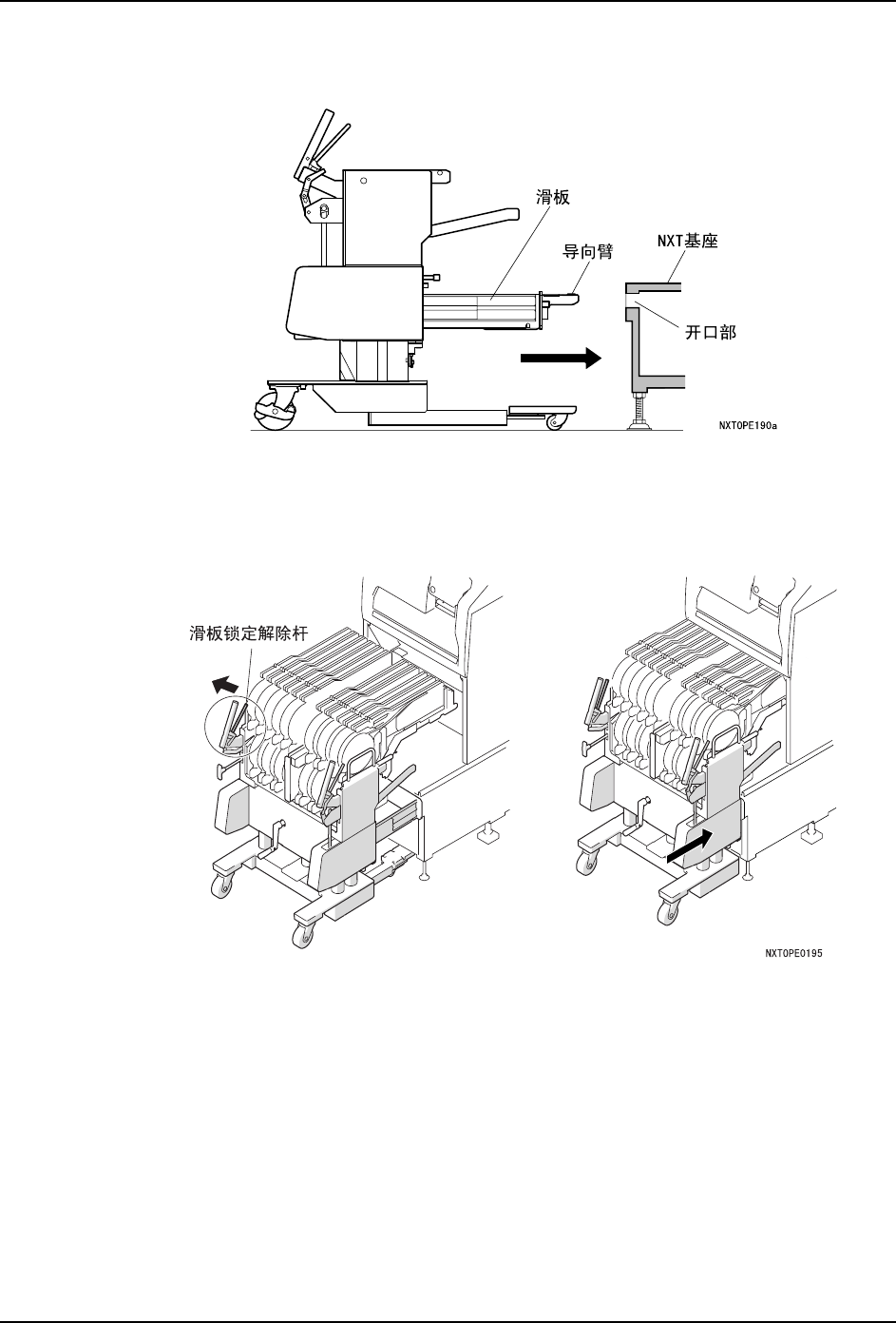 5. 换线 QD027-17 202 NXT 系统手册 7. 请握住导向臂解除杆,慢慢拉出 PCU 使之脱离基座。 5.9.3 料站托架的安装 备注 ) 以下说明在 M6(S) 模组中的操作,M3(S) 模组的安装步骤也同样如此。 1. 准备已放置了料站托架的 PCU。 旋转手柄使 PCU 上下移动, 请确认刻度使之对准机器的电 路板搬运高度。
