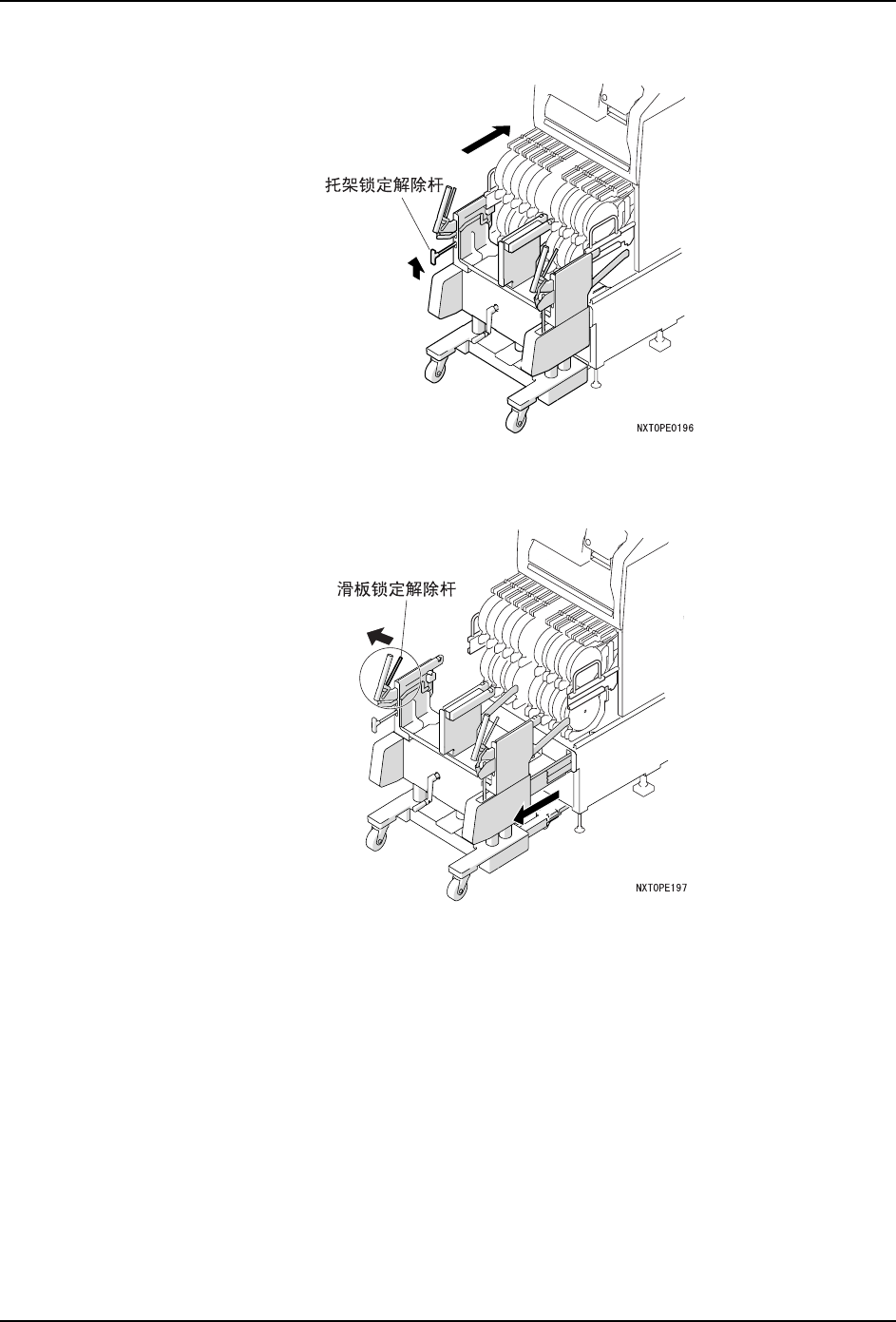 5. 换线 QD027-17 204 NXT 系统手册 4. 请提起托架锁定解除杆后,将料站托架插 入模组内。 备注 ) 转移到 PCU 上的料站托架被自动锁定。 5. 请握住滑板锁定解除杆,将 PCU 本体向后方滑动。