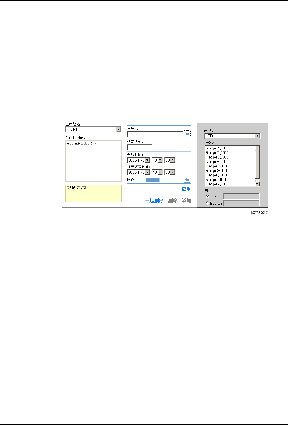 QD027-17 7. 附加软件 NXT 系统手册 257 7.9 生产计划表 创建生产计划表后, 可以显示出预定生产量或者各种 各样的生产线的运转监视器内的设定 。 因为在此创建的生产计划表的内容仅仅反映在附加软件内的进程 监视器上, 所以对于机器 上的实际生产没有任何影响。请 按照工厂的工程管理预定创建计划 表。 7.9.1 新建计划表的创建 1. 从运转监视器以及趋势画面的标题菜单 中单击 [ 计划表 ],显示出计划表的编辑器。 …