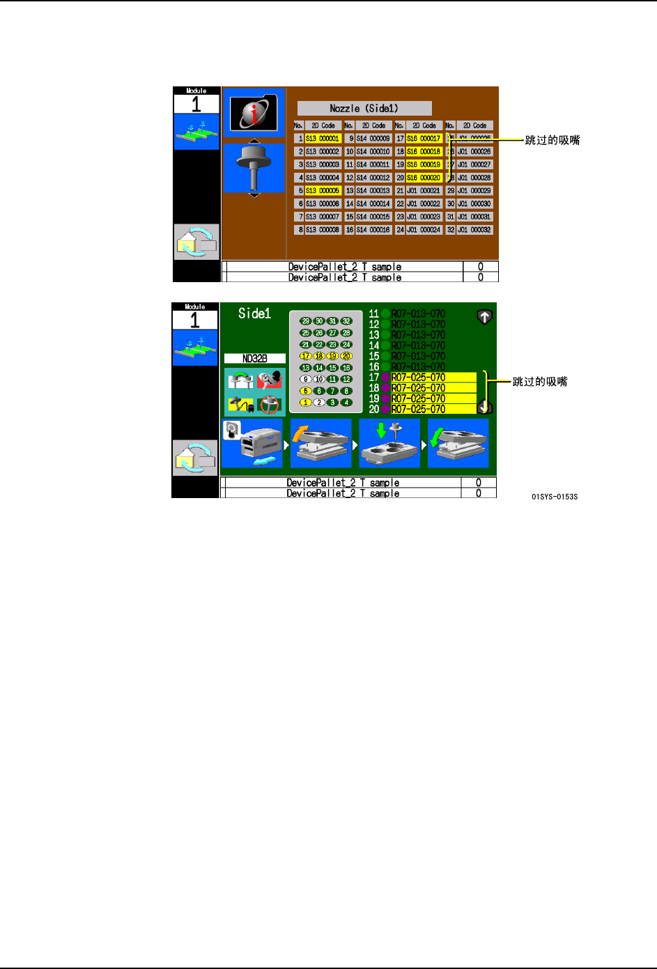 这些显示画面以黄色的背景色显示跳过的吸嘴。