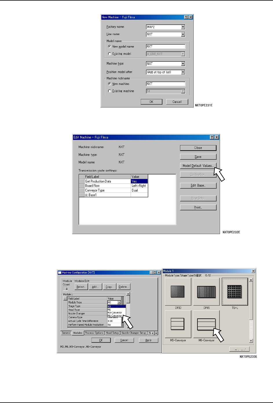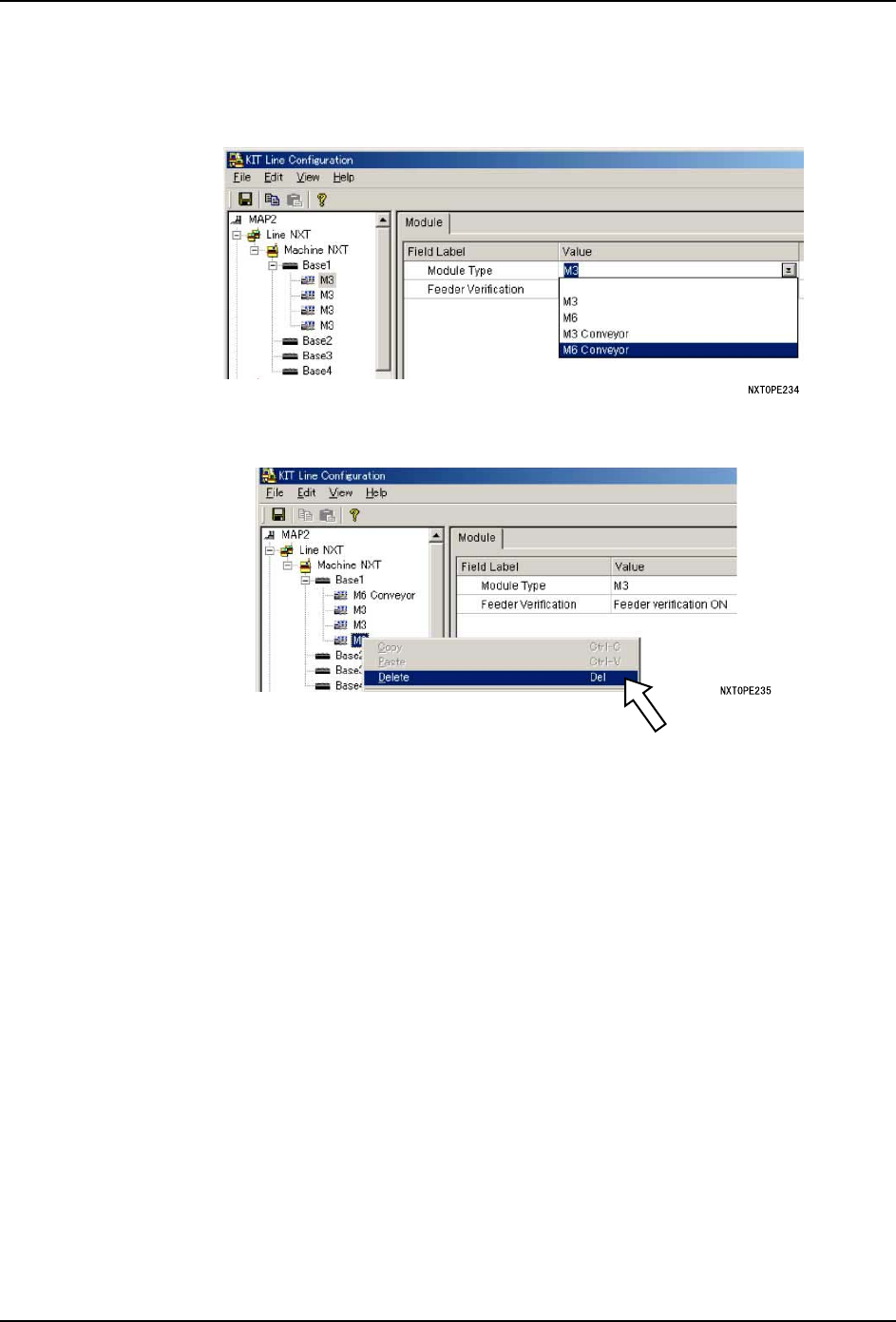 QD027-17 4. 生产 NXT 系统手册 129 8. 在 Fujitrax 的生产线 构成中设定模组搬运 轨道。 a. 首先,启动 KIT Line Configur ation。请将设置了模组搬运轨道的位置的 [Module Type] 变 更为 [M 6-Conveyor]。 备注 ) 当 2 台 M3(S) 模组变更为 M 6 模组搬运轨道时,将光标对准所显示的对象模组右击后,执行 [Delete] 减去 1 台模组,使之…