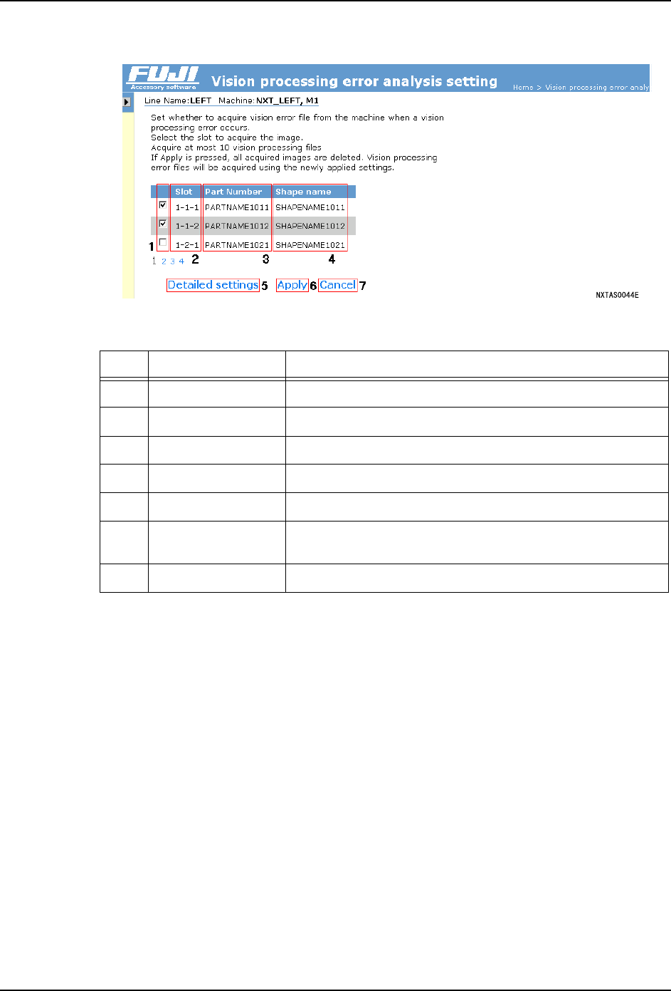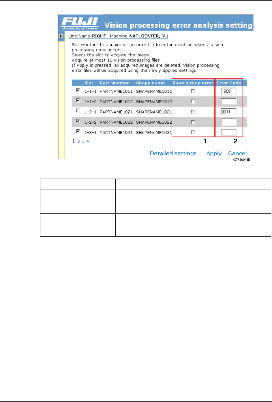 7. 附加软件 QD027-17 240 NXT 系统手册 各显示项目的说明如下。 号码 项目名 说明 1 容许吸取失败 选择是否将吸取失败作为影像 处理错误来识别。取得吸取 失败的影像信息时,进行选择 。不想使吸取失败的影像压 迫影像信息的保存区域时,请 不要选择。 2 错误编码 只是在发生特定的错误时,作 为影像处理错误来识别时, 请在这里设定错误编码。此栏 为空时,将所有的错误影像 作为影像处理错误来识别。