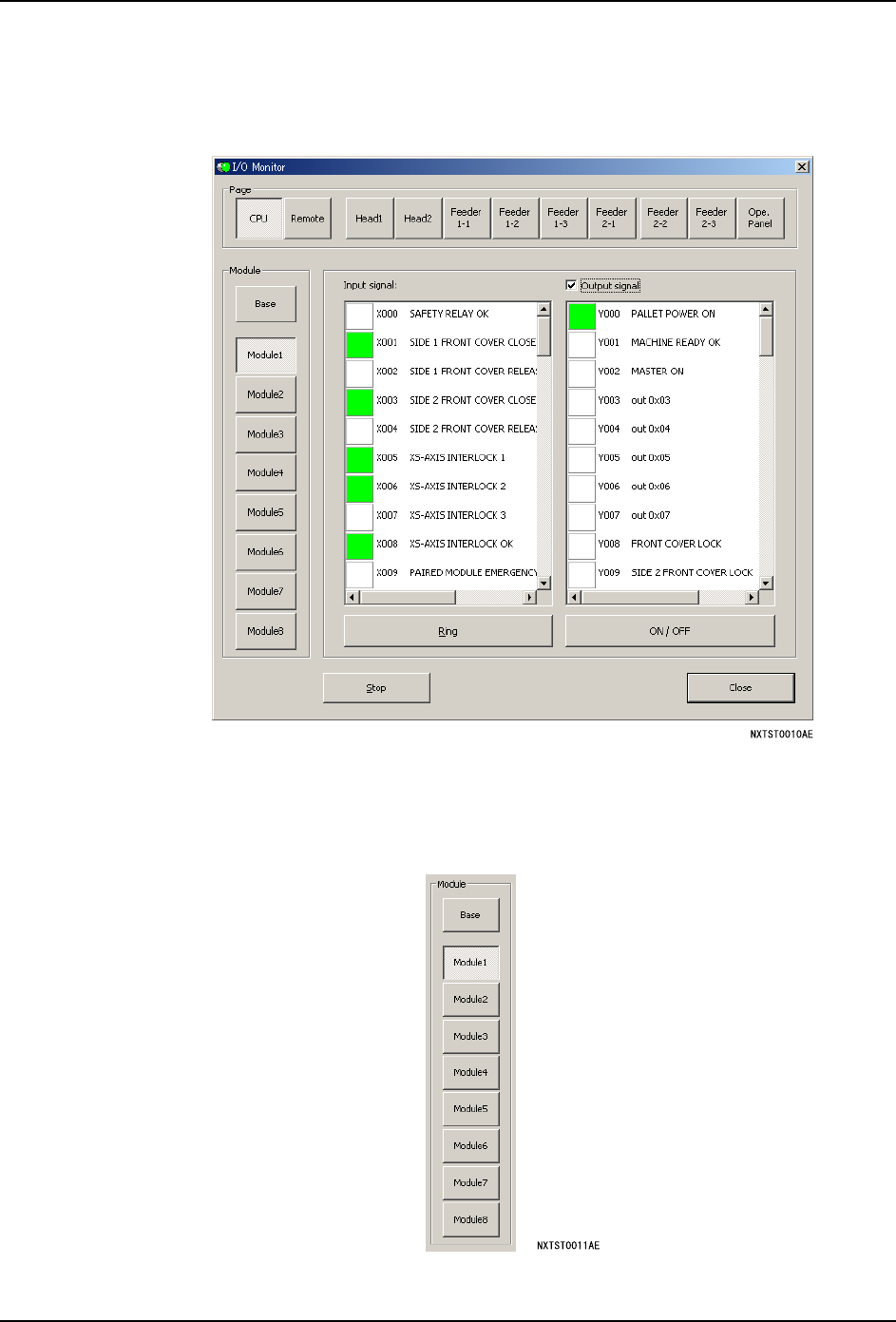 8. NXT 软件工具 QD027-17 290 NXT 系统手册 8.10 I/O 监视器 使用这个软件, 可以显示或者变更基座和模组的 I/O, 启动这个软件后, 显示出以下的对话 框。 8.10.1 对话框内的项目 [Module] 群组 为了确定 / 显示在哪个区段而使用。