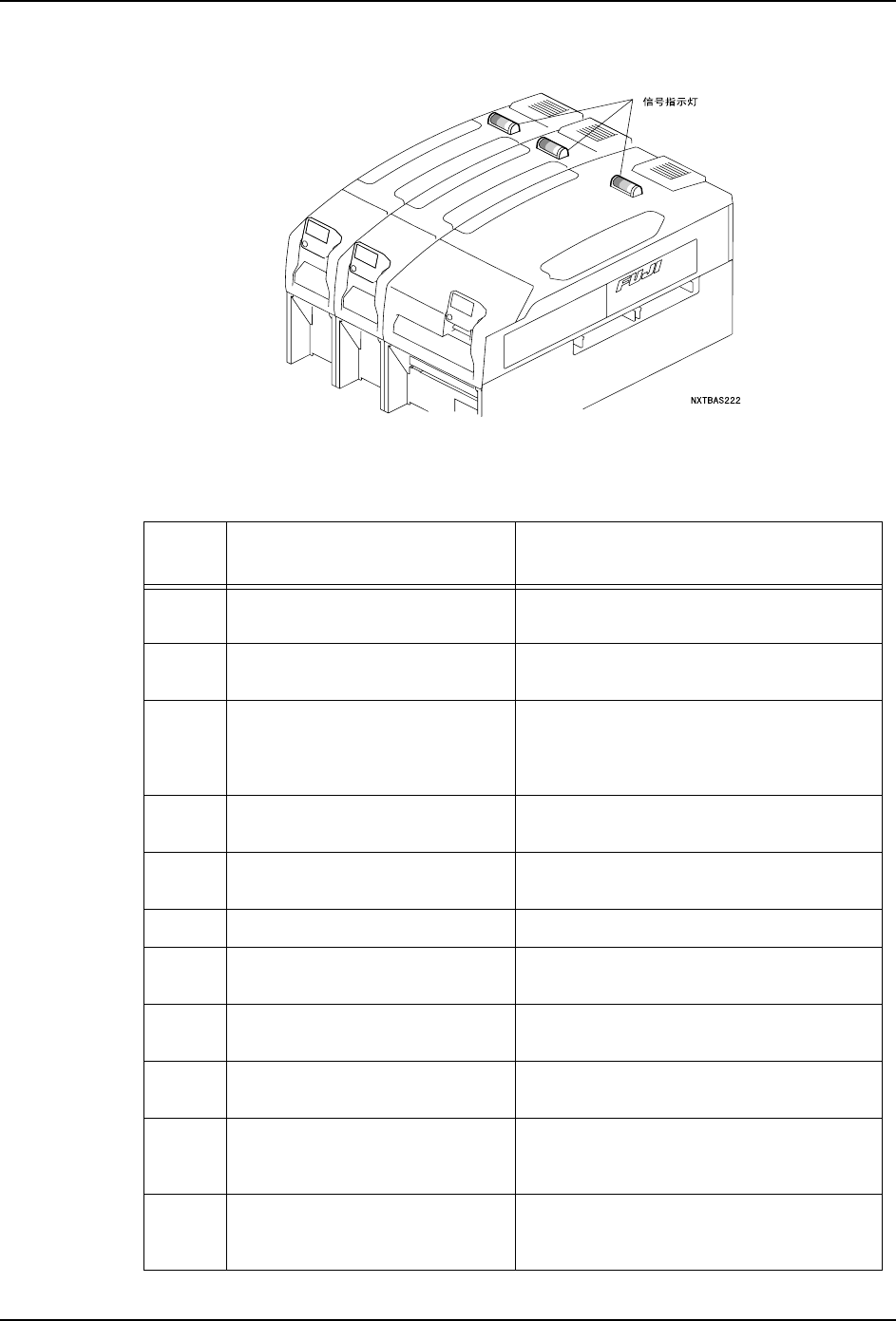 QD027-17 2. 各部分的名称和功能 NXT 系统手册 25 2.3 信号指示灯 2.3.1 指示灯的表示和机器的状况 通过 3 色信号指示灯的闪烁、灯亮、灯灭的变换,操作者能够随时 知道机器的运转状况。 对策 优先度 信号指示灯表示 机器的状况 1 发生异常 (Machine error) 发生了自身无法复原的异常 2 要求操作者操作 (Awaiting opera tor setup) 显示元件的安装向导画面 等待双模组启动 …