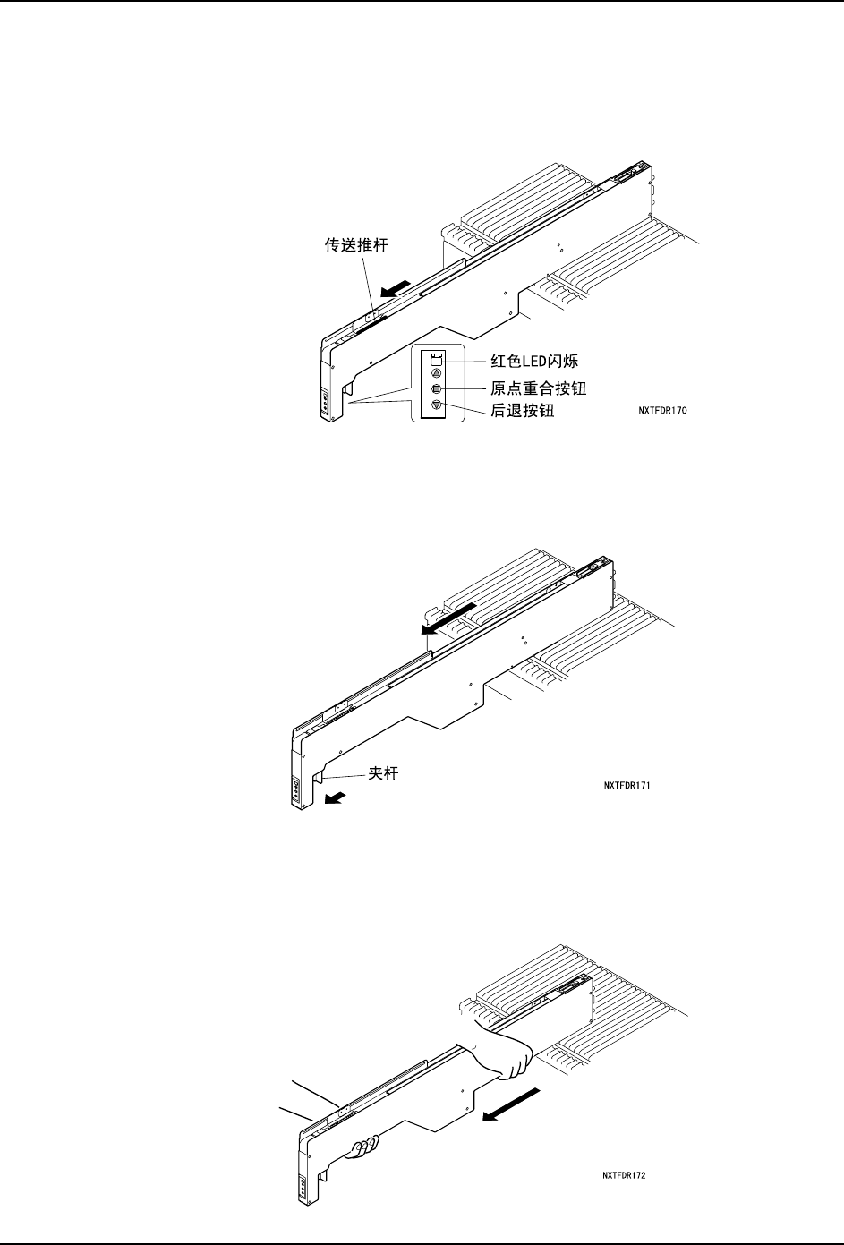 4. 生产 QD027-17 52 NXT 系统手册 Look For Removable 上设定的场合 1. 在 操作画面上显示出向 次供料器 (Re movableFeeder) 的初始料槽进行插入更换的向 导。 请取出次供料器 (Removab leFeeder)。在初始 料槽侧红色 LED 开始 闪烁。 注意 ) 多个料站发生料尽时, 请一个一个更换供料器。同时卸下 2 个以上的料尽的供料器时,就不会 显示正确的更换向导。 2.…