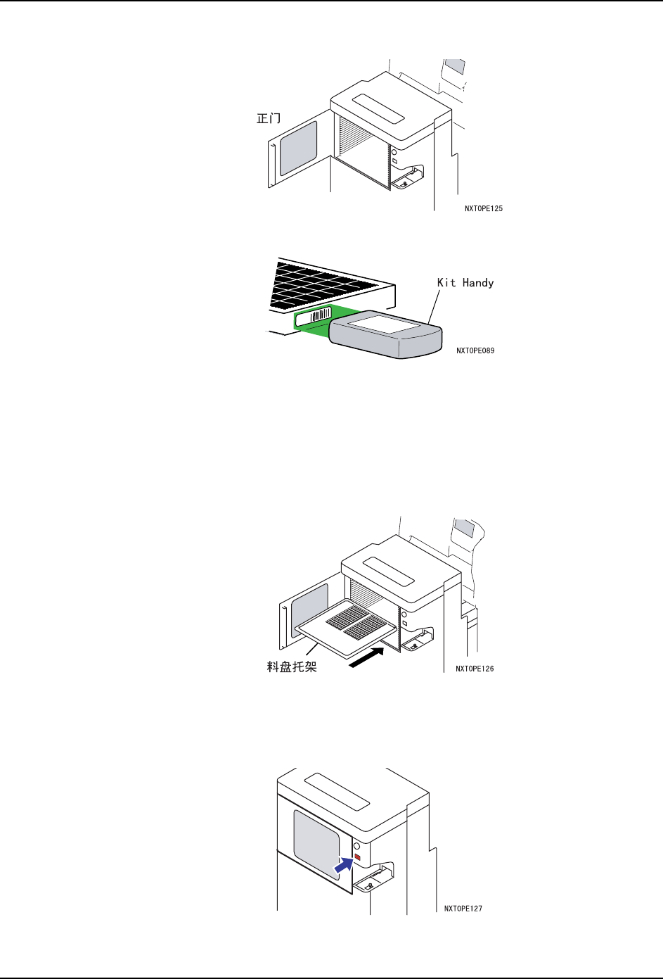QD027-17 4. 生产 NXT 系统手册 61 1. 打开料盘单元 -L 的正门。 2. 请 使用 KIT Han dy 进行新料 盘的验证检查。 a. 在 KIT Han dy 画面上选 择补充对象的料站。 b. 使 用 KIT Hand y 进行元件条 形码或者 DID 的扫描 。 备注 ) 关于料盘的验证检查,请参照 [Fujitrax Verifier 操作手册 ] 的 [29. 料盘验证操作步骤 ]。 备注 ) 扫描后,…