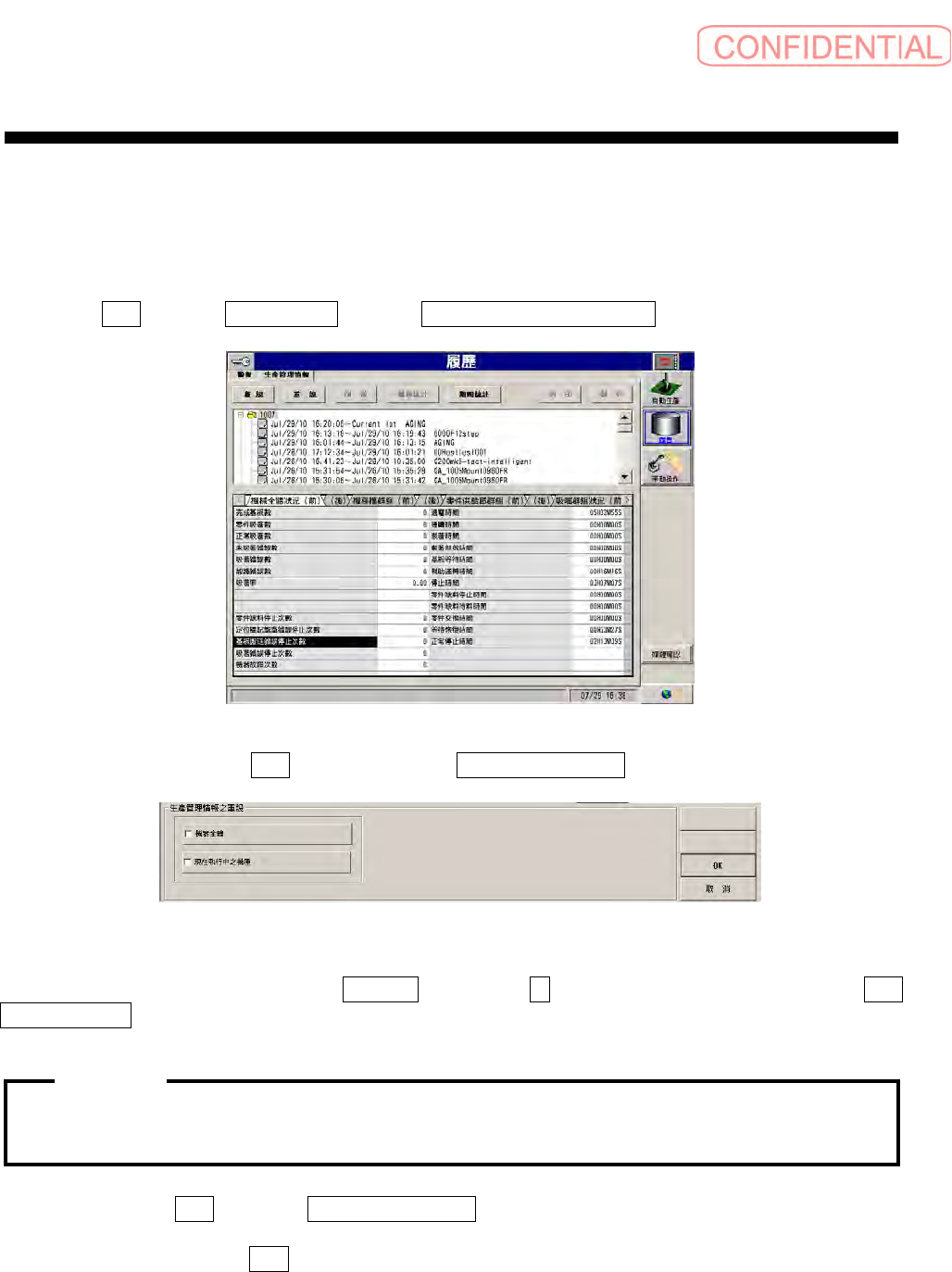 清除现在的表示内容时,点击 重设 键,会出现以下的 生产管理信息的重设 对话框。