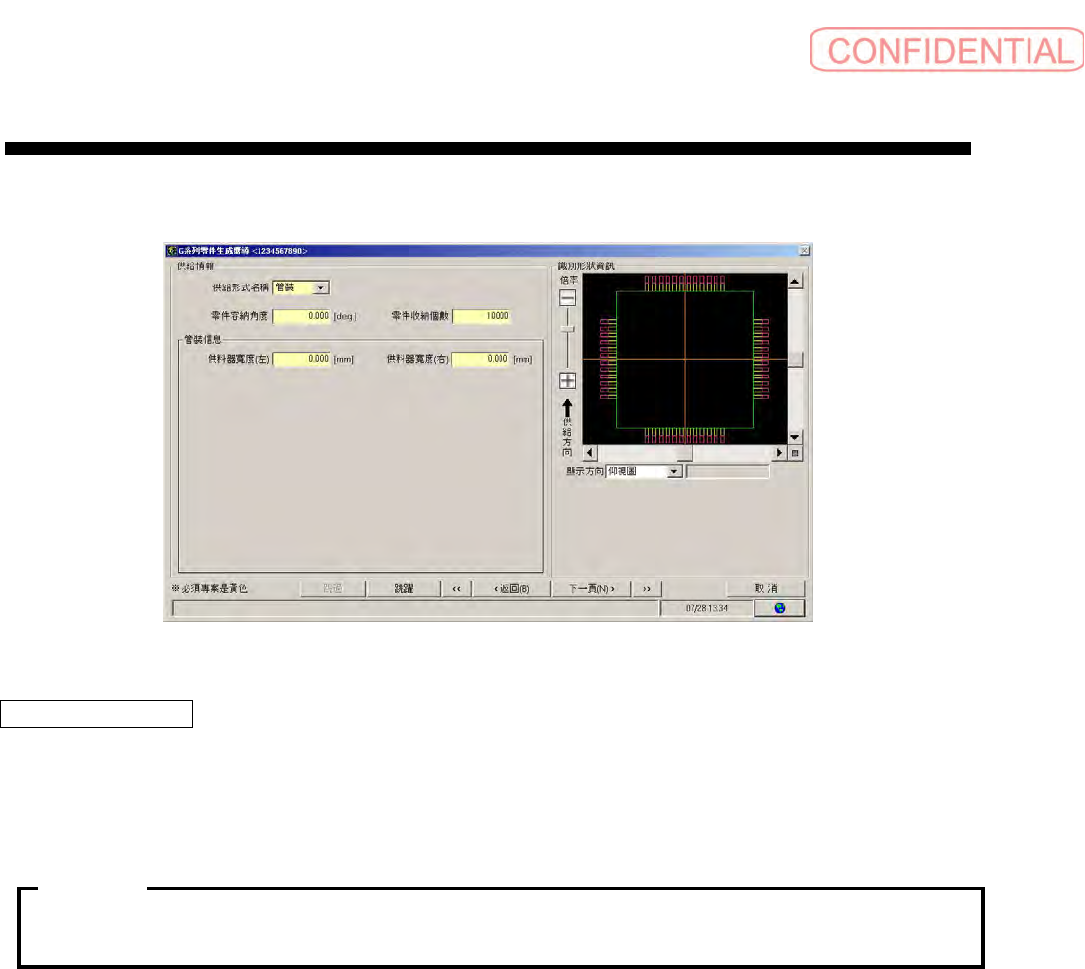 操作篇 电 子零件 贴装 机 SI-G200MK7 系列 1-164 1.2.3.2 管装供给形式的场合 图 1.2.3-2 零件生成向导-供给信息画面(管装) 供料器宽度(右)/(左) : 以零件的定位针中心线作为基准时,输入供料器左边和右边的宽度。 单位:mm 设定范围:0/0.001~999.999※ ※不能左右两边的宽度都设定为 0[mm]。 黄色的区域是必须项目。 注意∶