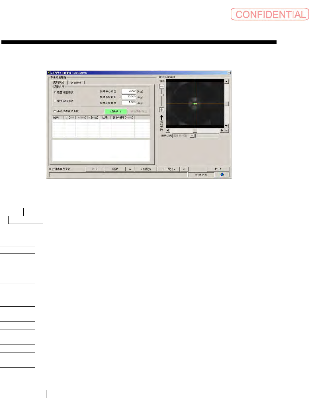 操作篇 电 子零件 贴装 机 SI-G200MK7 系列 1-176 1.2.7 零件识别选配画面 1.2.7.1 零件测试 图 1.2.7-1 零件生成向导-识别测试画面 识别角度 : 吸着偏离测试 : 将零件某一应有的角度作为旋转中心角度固定, 通过仅让实际零件回转, 进行识别, 从而对于吸着时的零件 偏离能够验证其安全度。 零件旋转测试 : 通过在使零件某一应有的角度和实际 零件的角度一致状态下, 让零件旋转进行识别, 可以对于生…