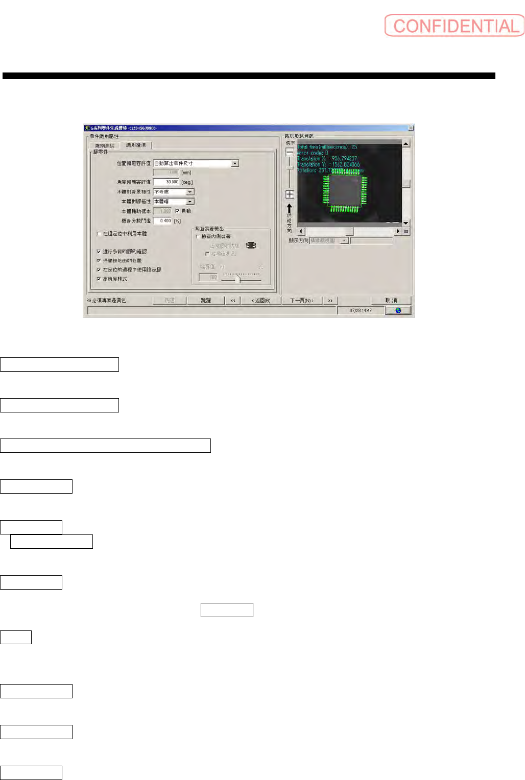 操作篇 电 子零件 贴装 机 SI-G200MK7 系列 1-180 择代表点进行本体识别。 本体辅助样本取得越大所需识别时间越短。 此功能仅在选择本体辅助样本自动确认 时有效。 本体辅助样本自动检查 : 设定是否自动计算适当本体辅助样本。 本体判定临界值 : 使用本体粗定位时,为了判断是否用本体定位而设定的临界值。 在粗定位中利用本体 : 设定计算零件大致位置时, 是否使用本体的信息。 当明确显现出本体时有效。 当本体检出失败时, 自…