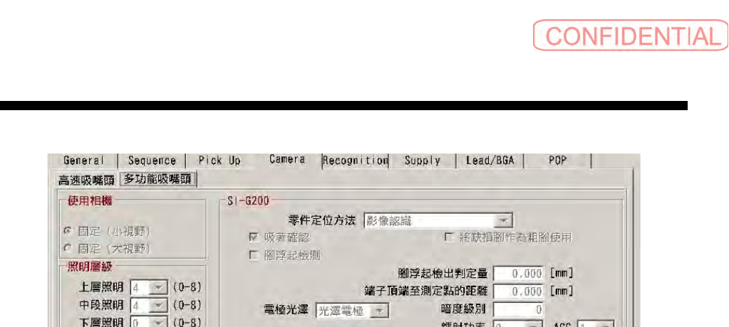 操作篇 电 子零件 贴装 机 SI-G200MK7 系列 1-188 1.3.4 Camera Camera 表示相机数据以及吸着确认方活 。 1.3.4.1 高速贴装头 图 1.3.4-1 Camera 画面 (高速贴装头) (1) 贴装头类型标签 复数个类型的贴装头可使用时,选择设定零件信息对象的贴装头信息。不显示不能够选择的贴装头。 (2) 使用相机 执行移动·固定相机的选择。 (3) 照明方式 选择照明的亮度方式。 此设定按 相…