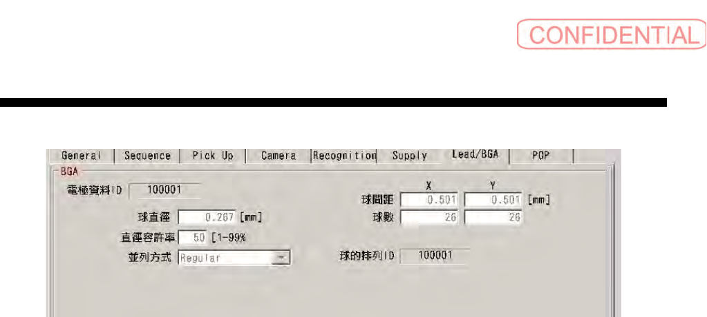 操作篇 电 子零件 贴装 机 SI-G200MK7 系列 1-199 1.3.7.2 BGA 图 1.3.7-2 Lead/BGA 画面 (BGA) (1) 电极数据 ID 表示代表电极数据的 ID 编号。 (2) 球直径 输入球的直径。 单位:% 设定范围:0.001~99.999 (3) 直径容许率 输入球的直径的容许 率 。 单位:% 设定范围:1~99 (4) 并列方式 选择球配置的基本形状。 Regular:格子状配置 Che…