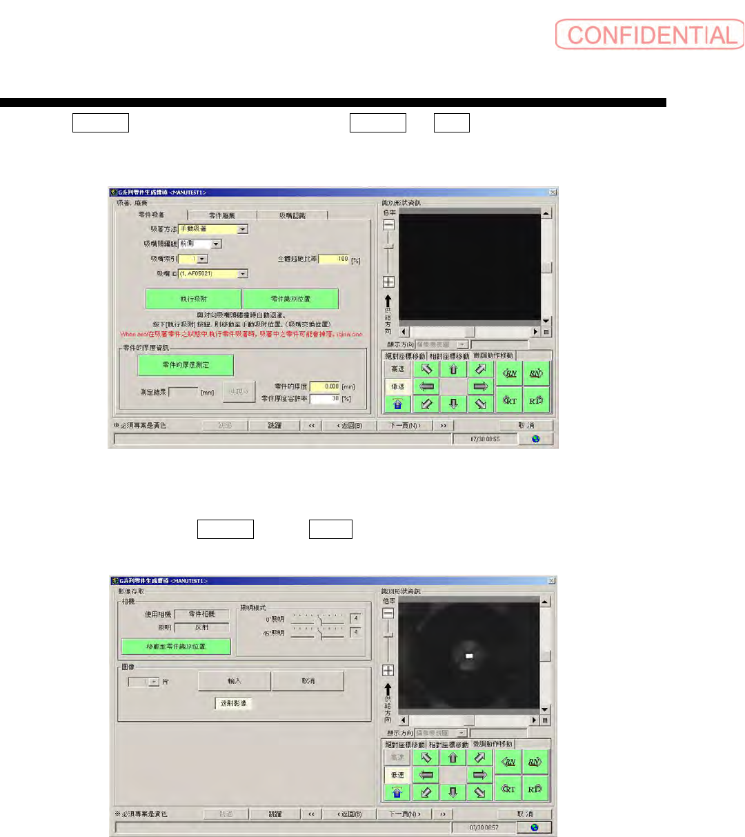 操作編 电子零件贴装机 SI-G200MK7 系列 1-206 之后,选择 零件吸着 重新选择正确的吸嘴,依顺序 点击 执行吸附 、 START 键,再次移动贴装头至手动吸着 位置。 图 2.1.3-5 零件吸着 画面 用手将零件吸着到吸嘴上,输入 零件厚度 ,点击 下一页 。 图 2.1.3-6 影像存取 画面