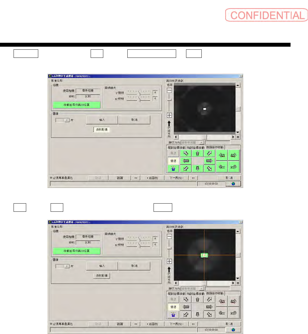 显示 影像存取 画面,依顺序点击 相机 框内的 零件识别位置移动 、 START 键, 移动零件至指定的相机位置。