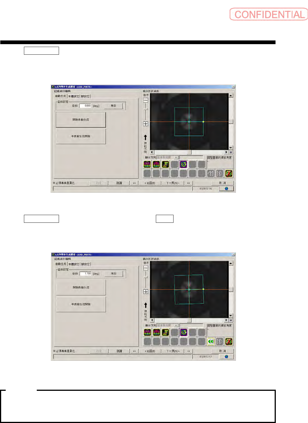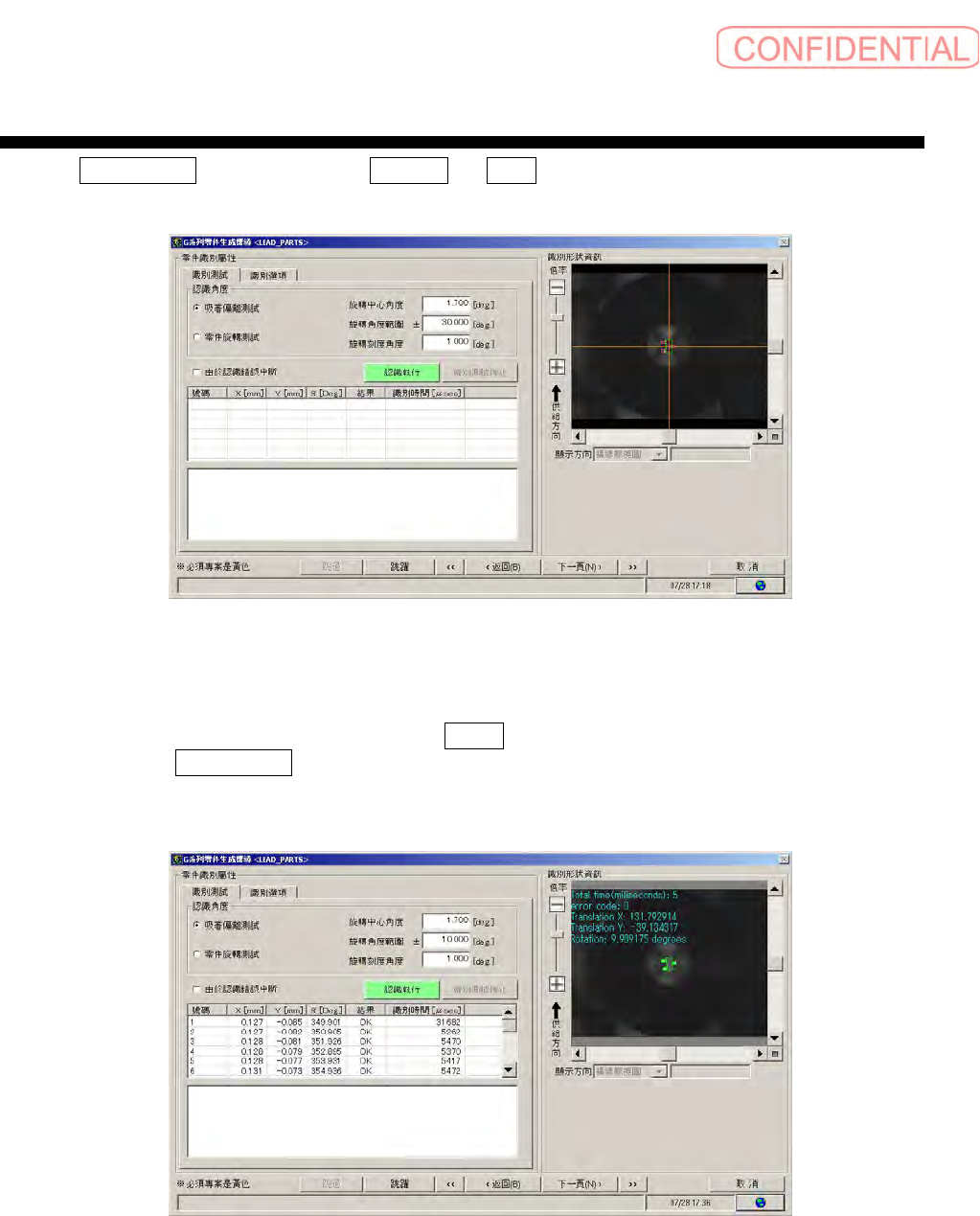 操作編 电子零件贴装机 SI-G200MK7 系列 1-215 显示 零件识别选择 画面,依顺序点击 识别执行 、 START 键, 进行识别。 图 2.1.4-9 零件识别选择 画面 识别结果显示在画面里,若识别结果满意,点击 下一页 。 识别执行中,按 识别测试停止 键则停止识别处理。 图 2.1.4-10 识别设定后 画面