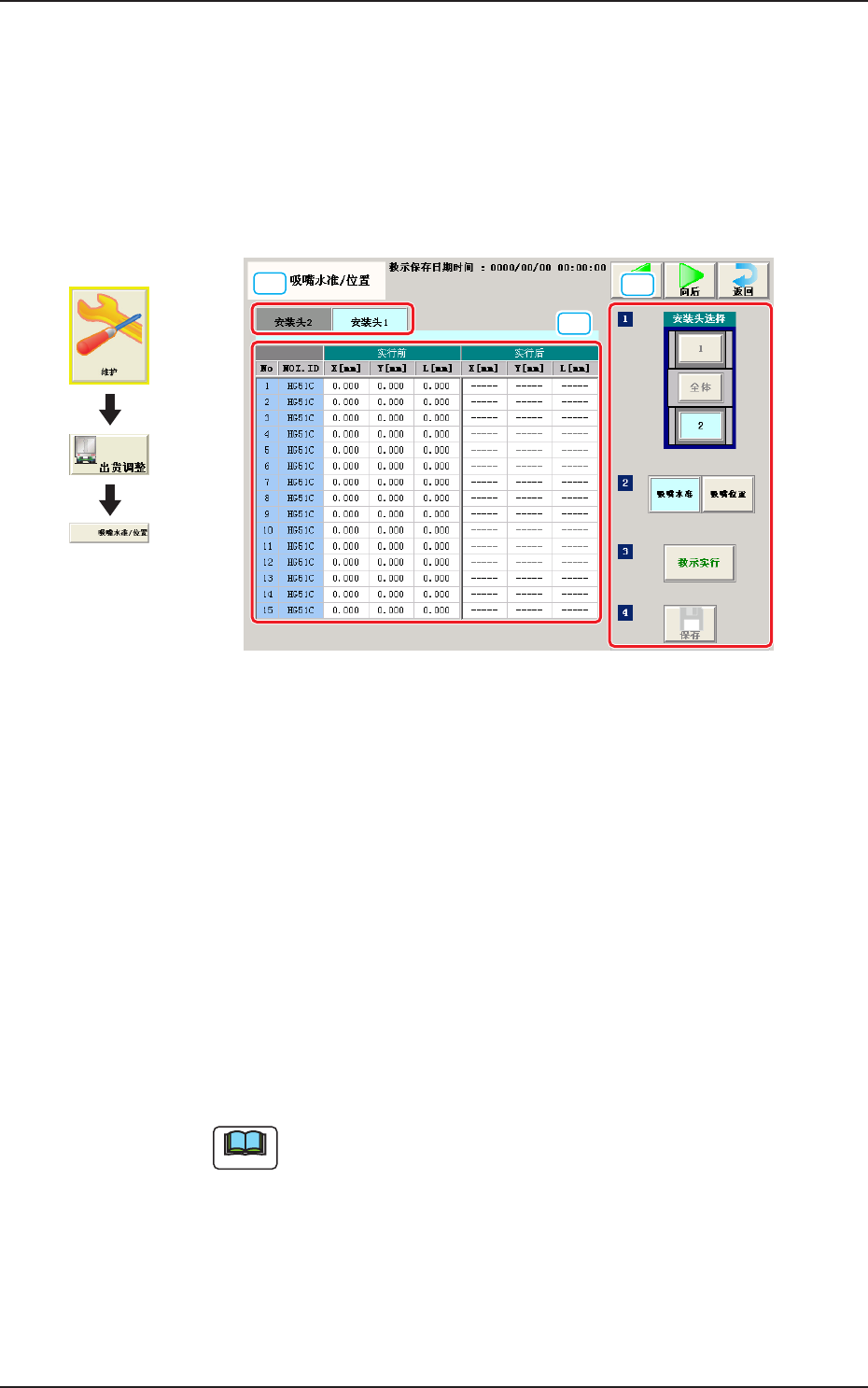 3OM-1752 1-62 界面显示切换 通过按下各教示对应的按钮,可以切换到对应界面的显示。 进行切换显示界面的教示。 各界面对应的按钮如下。 吸嘴水准 : 切换到吸嘴水准的教示界面。 吸嘴位置 : 切换到吸嘴位置的教示界面。 [ 教示实行 ] 按钮 实行教示。 [ 保存 ] 按钮 保存教示结果。 • 吸嘴水准教示的步骤 Procedure (1) 选择实行吸嘴水准补正值教示的安装头 (1、2…