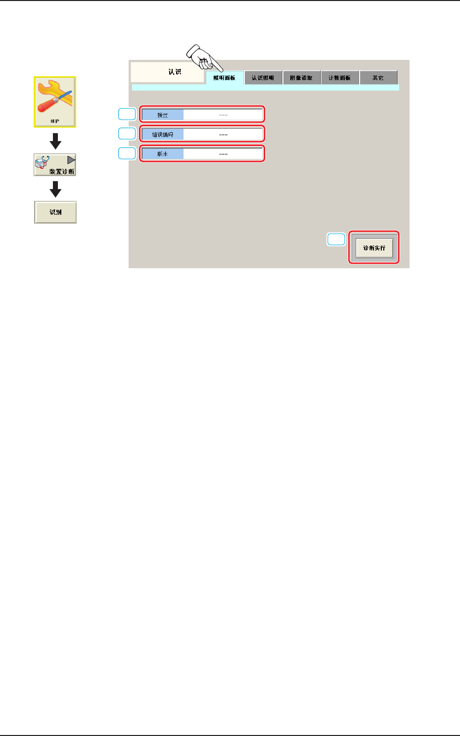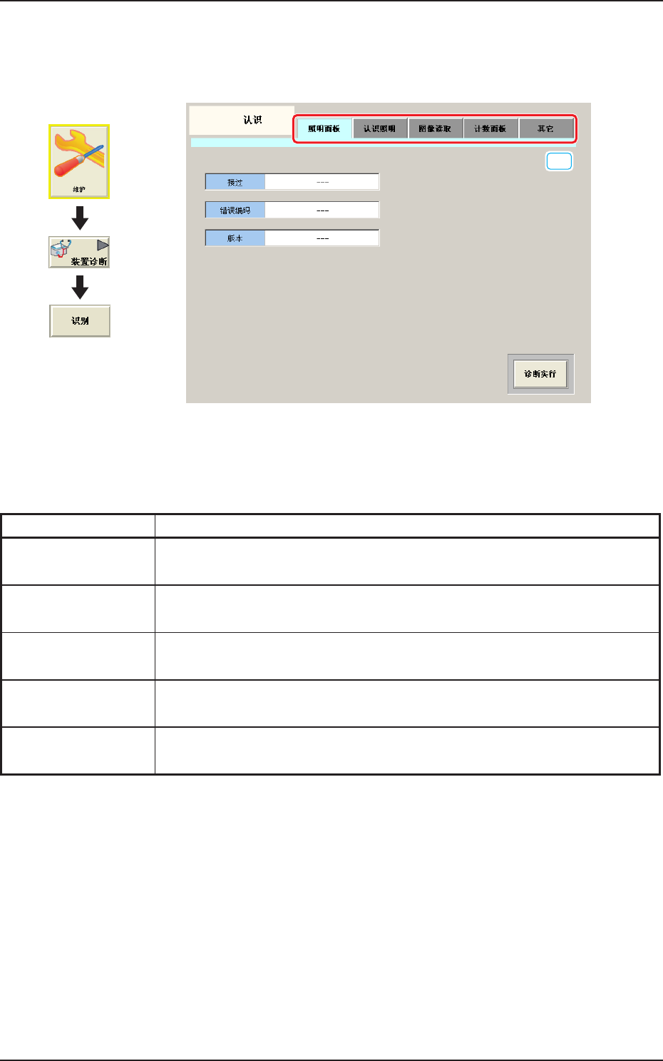 3OM-1752 1-86 6.3 认识 ( 识别 ) 显示元件识别及线路板识别的输入信号诊断状况。 [1] F3A72 [1] Tab “ 认识 ” 界面分为以下 5 个选项卡, 按下 Tab, 便显示各选项卡。 Tab 内容 照明面板 进行照明面板的诊断。 认识 ( 识别 ) 照明 进行元件识别照明、线路板识别照明的检查。 图像读取 进行元件识别照相机、线路板识别照相机的检查。 计数面板 进行横梁的计数值确认,确认接线…
