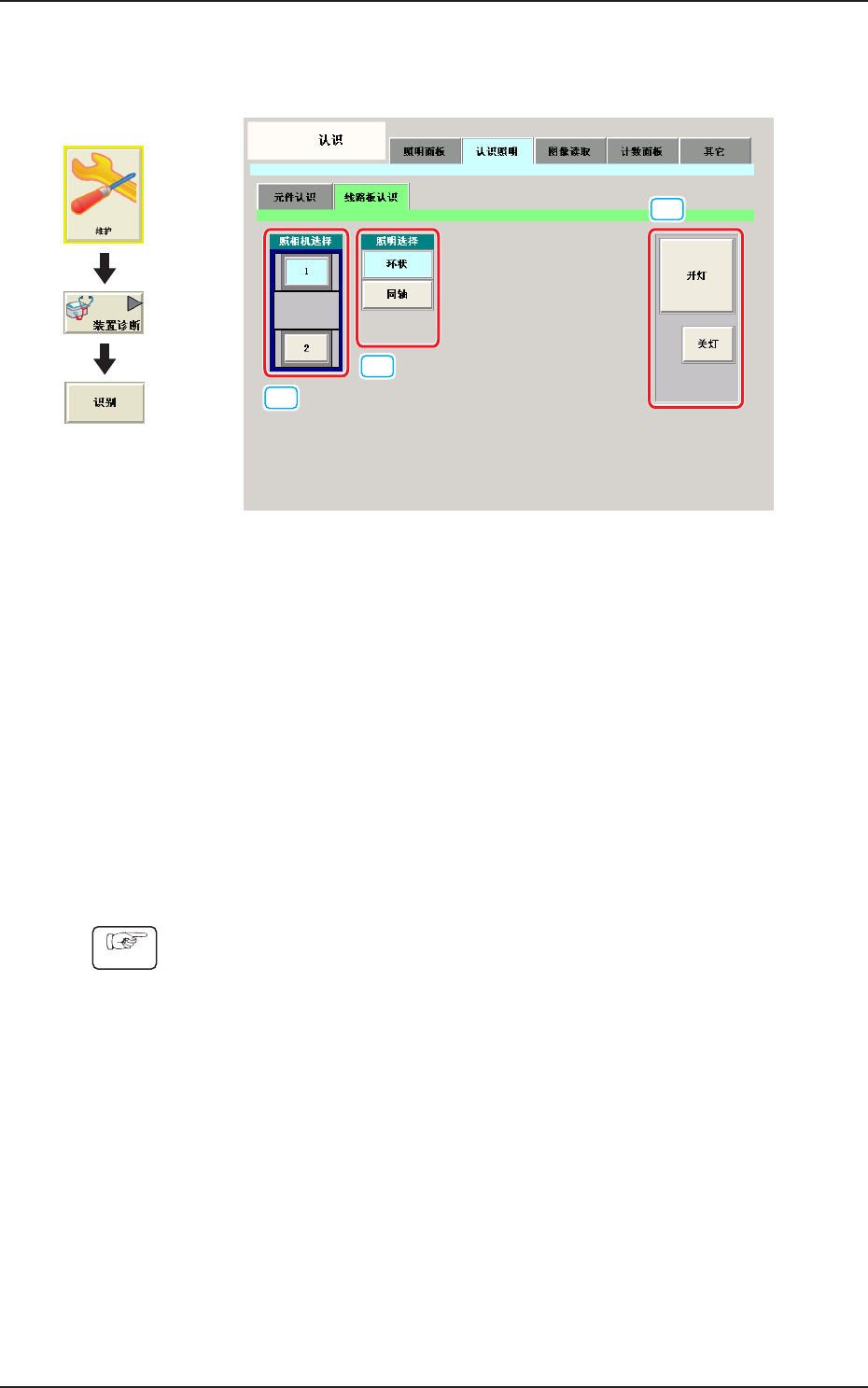 3OM-1752 1-91 6.3.2.2 线路板认识 ( 识别 ) 在 “ 认识照明 ” 选项卡,按下 [ 线路板认识 ]Tab,便显示以下界面。 [1] [2] [3] F3A76 [1] 照相机选择 配置有表示线路板识别照相机位置的按钮。  选择进行线路板识别照明确认的元件识别照相机。 [2] 照明选择 选择想要进行确认的照明方式。 [3] [ 开灯 ] 按钮 /[ 关灯 ] 按钮 对 “ [2] 照明选择按钮 ” 选…