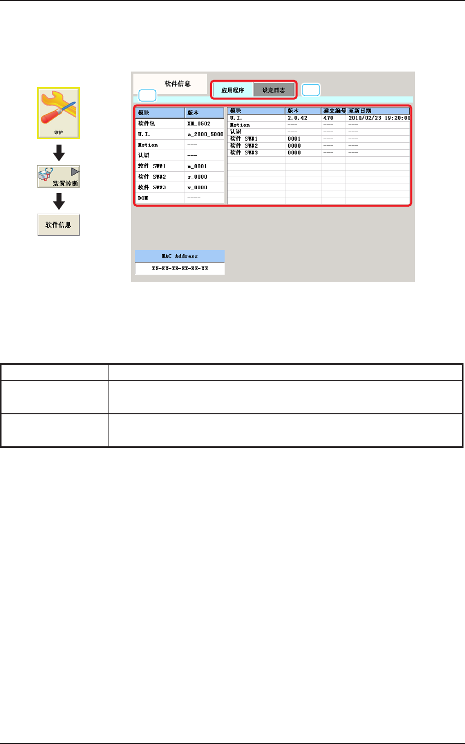 3OM-1752 1-99 6.5.1 应用程序 显示应用程序情报。 F3A84 详细显示 显示每个模块的应用程序版本、应用程序更新时间、MACAddress。 1304-001 界面展开 6.5软件信息