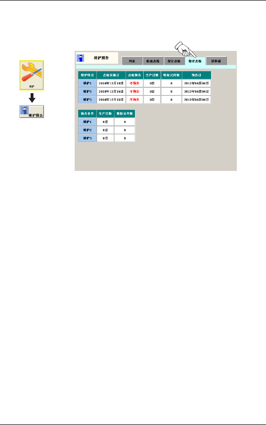 作为进行维护预告的条件,显示生产日数、吸取元件数。
