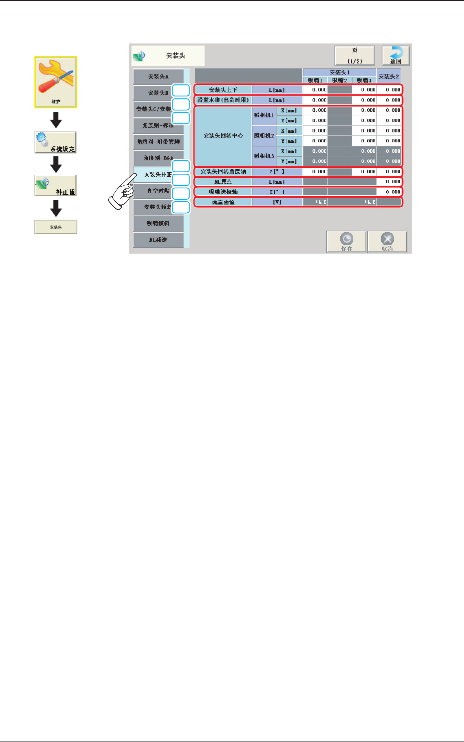NL 轴旋转时,为补正吸嘴上下机构和吸嘴轴偏离的补正值数据。