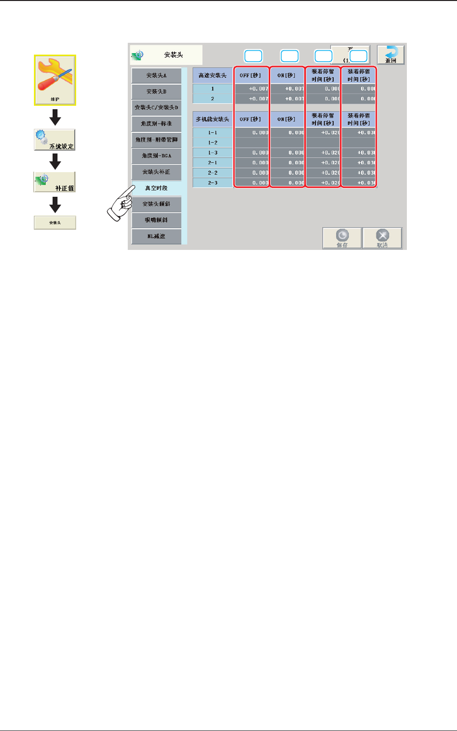 真空时段 ON 数据以到达 NL 轴下至点前 10ms 为基准,输入正值为真空