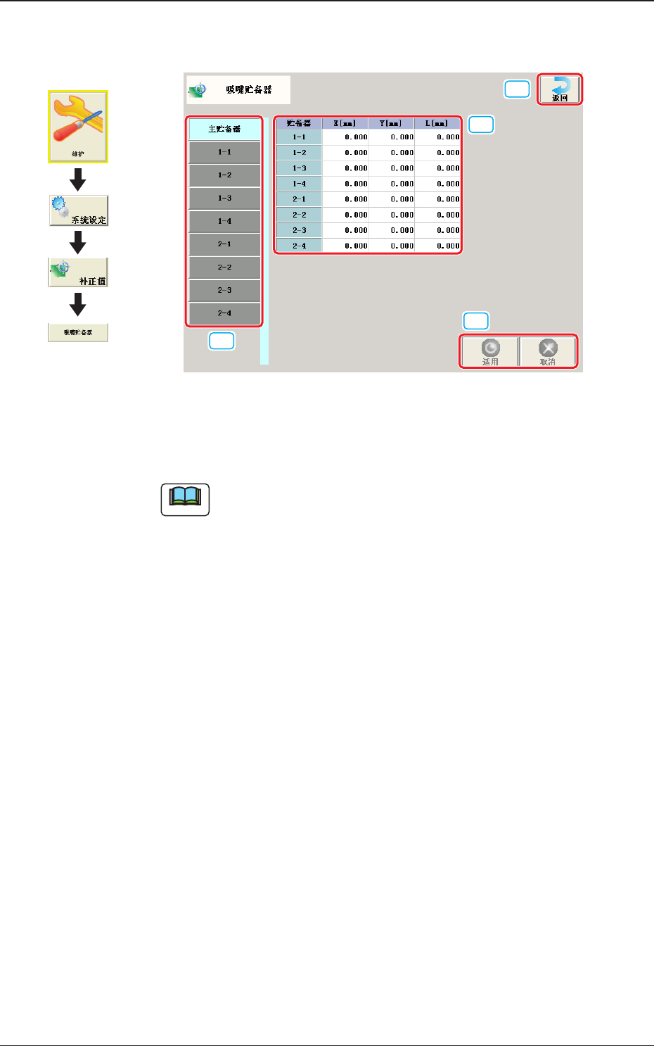 3OM-1752 2-57 2.7.1 1-1 ~ 1-4、2-1 ~ 2-4 在 “ 补正值数据 ” 选项卡中,按下 [ 吸嘴贮备器 ( 储料器 )]Tab,再按 [1-1]Tab,便显示以下选项卡。 Note (a) [1-2] 到 [2-4] 也显示相同界面。 (b) 界面的显示根据所选择的选项而有所不同。 [1] [2] F3B57 [1] X( 横 )、Y( 纵 )[mm] 用调整从线路板定位基准 XY 坐标…
