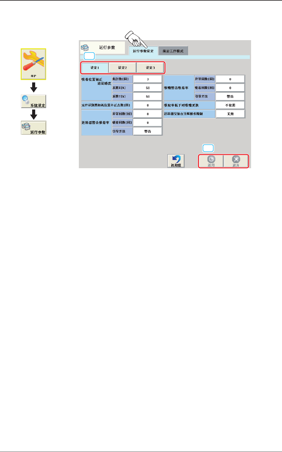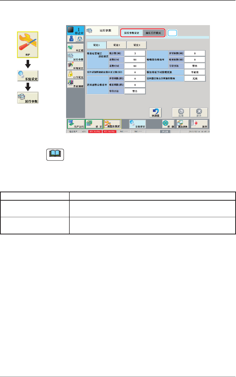 3OM-1752 2-70 1304-001 3. 运行参数 [1] F3B71 Note 界面显示根据所选择的选项而有所不同。 [1] 选项卡 “ 运行参数 ” 界面分为以下 2 个选项卡,按下 Tab,便显示各选项卡。 Tab 内容 运行参数设定 设定关于装置生产运行的各种参数。 前后工序模式 设定前后工序的动作模式、线路板搬送、位置定位条件。 T3B3 界面展开 3.运行参数