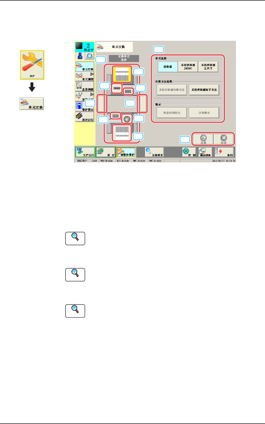 3OM-1752 1-3 2. 维护菜单 进行装置的调整或动作确认、教示等。 在桌面上按下 [ 维护 ] 按钮登录,便显示 “ 维护 ” 界面。 Note 根据用户权限,显示的界面有所不同。 F3A3 为显示实行装置维护各功能的操作界面,配置有 [ 维护 ] 主菜单按钮。 [单元交换] 按钮 显示 “ 单元交换 ” 界面。 显示 “ 单元调整 ” 子菜单。 请参照 “ 第一章 4. 单元调整 ” 章节。 请参照 “ 第一章…
