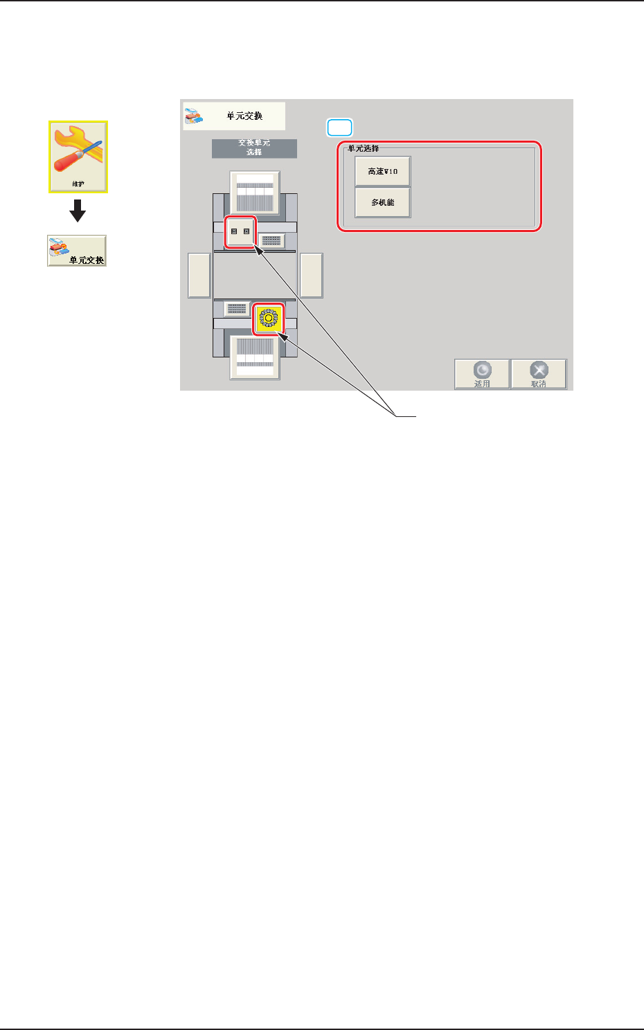 配置有各单元的图像按钮,按下交换单元按钮,便切换