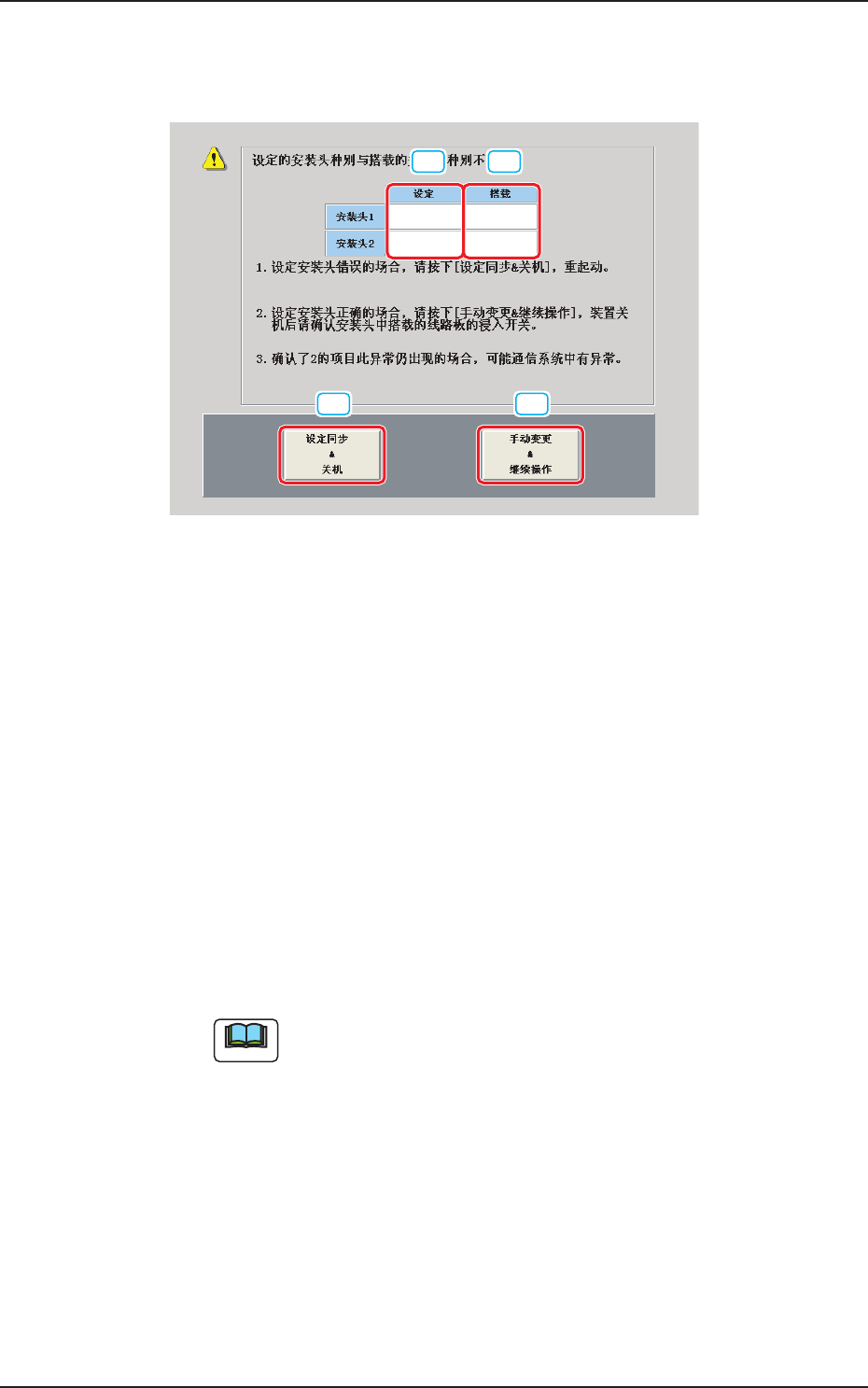 启动装置时搭载安装头和设定的安装头选项不一致时显示。