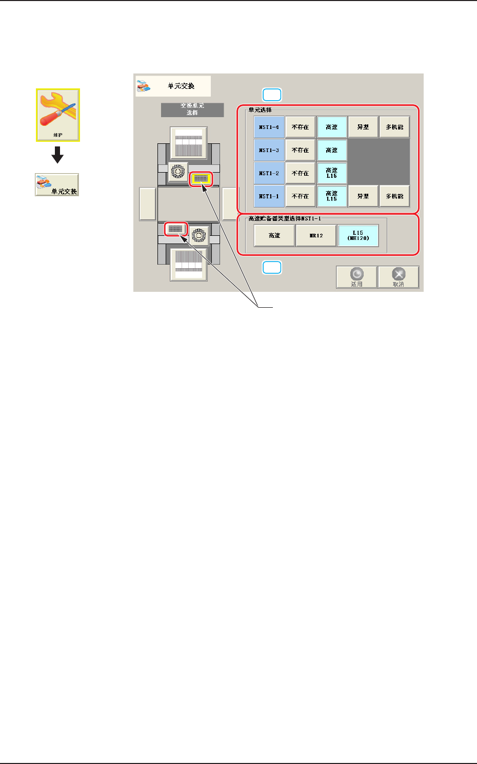 [ 异型 ] 按钮 : 切换到中异型吸嘴储料器 ( 选项 )。
