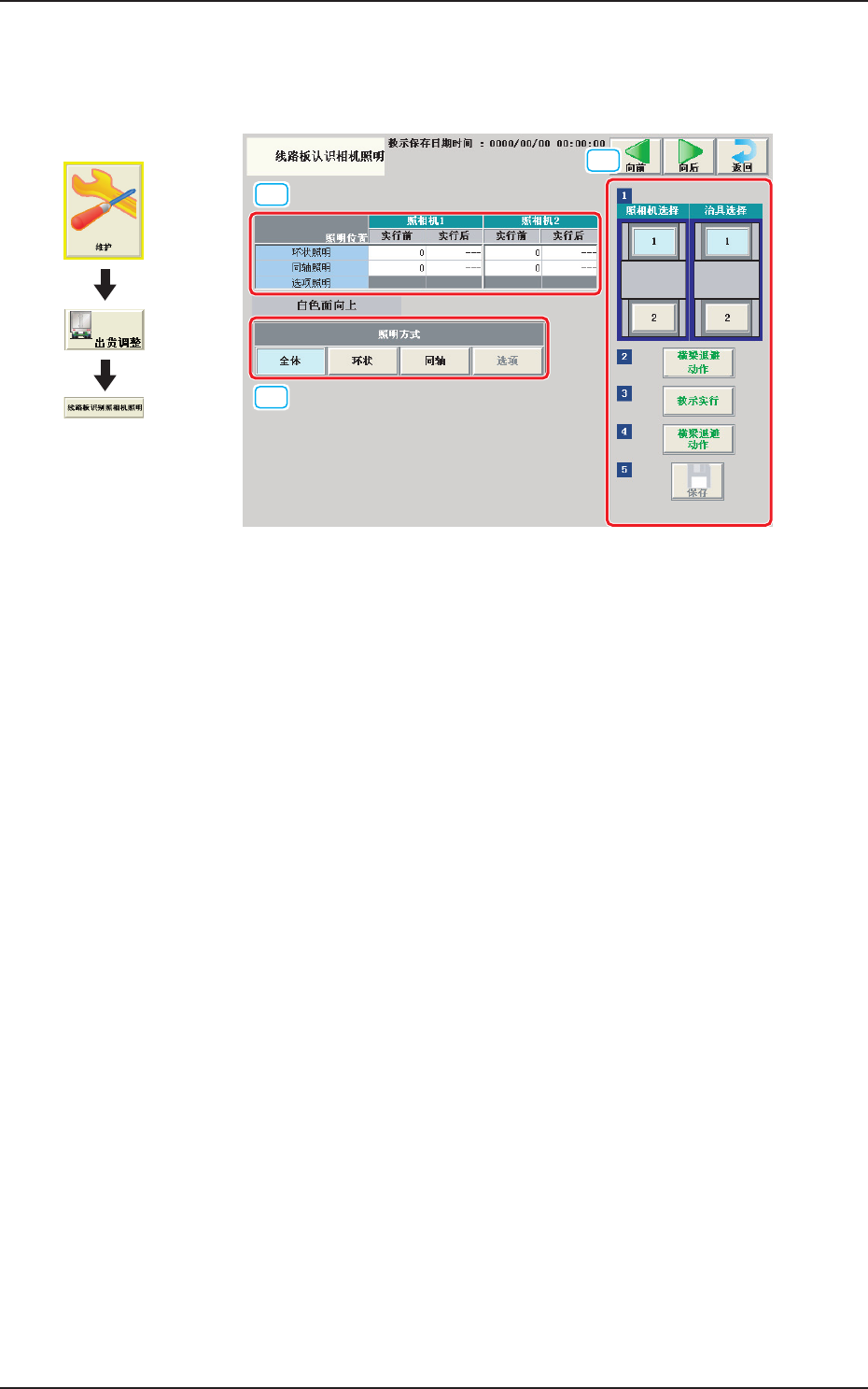 3OM-1752 1-36 5.5 线路板认识相机 ( 识别照相机 ) 照明 进行线路板识别照相机的照明教示。 [1] [2] [3] F3A30 [1] 教示数据显示部 显示指定照相机的各照明方式的补正值数据。 [2] 教示步骤显示部 配置有教示中使用的按钮。 照相机选择 用图像显示表示线路板识别照相机的按钮。 请选择进行教示的线路板识别照相机。 治具选择 请选择设置治具的模块。 [ 横梁退避动作 ] 按钮 将 …