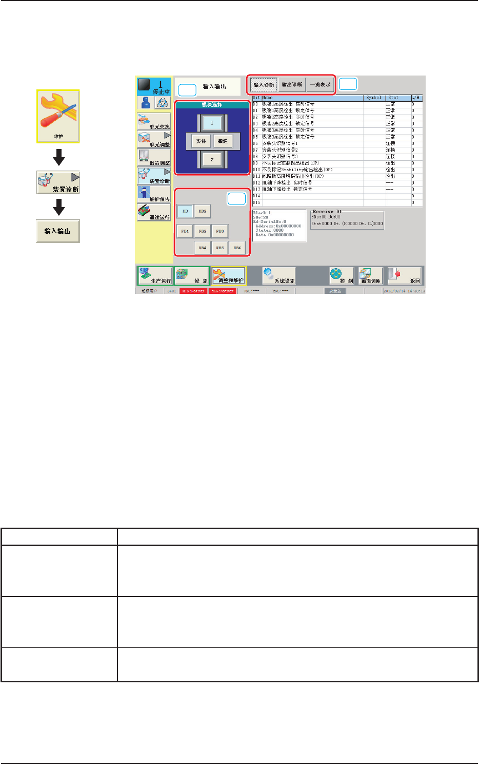 3OM-1752 1-70 6.1 输入输出 诊断各部分的输入输出状态。 [1] [2] [3] F3A50 [1] 模块选择按钮 在装置的图像中显示的各模块被设为按钮。 按下按钮,选择诊断 I/O 状态的模块。 [2] 单元选择按钮 配置有用模块选择按钮选择的模块各单元按钮。 选择诊断 I/O 状态的单元。 [3] [ 显示切换 ] 按钮 按下按钮,显示对应的各界面。 各界面的说明如下 : 按钮 内容 输…