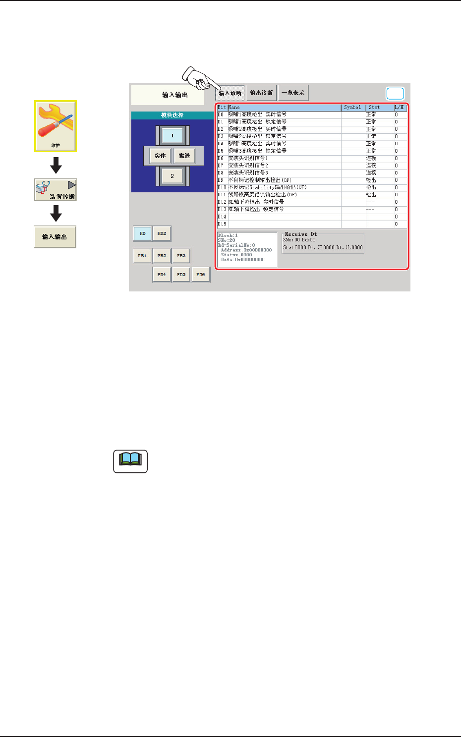 输入诊断 显示用左侧的模块选择按钮及单元选择按钮选择的单元各传感器的输