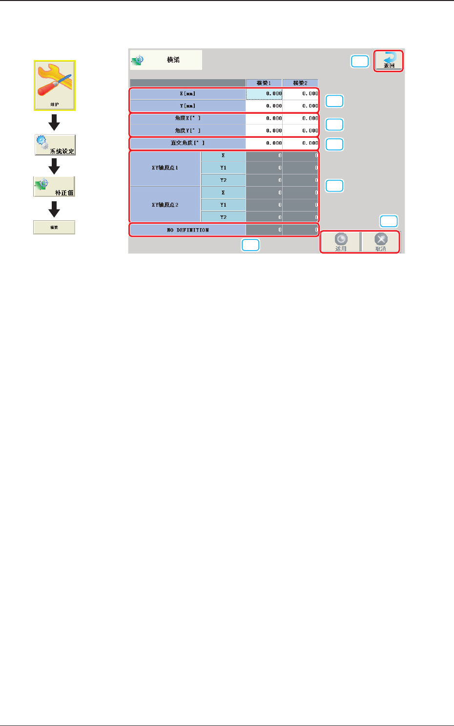 将横梁 X 及 Y 轴对准装置基准坐标系的数据。