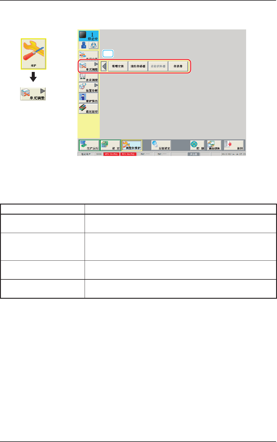 3OM-1752 1-1 1 1304-001 4. 单元调整 [1] F3A13 [1] “ 单元调整 ” 子菜单 为显示实行单元调整各功能的操作界面,配置有以下按钮。 功能选择按钮 内容 吸嘴交换 进行手动动作下吸嘴的贴装、收纳的单动动作。 线性传感器 用图表及数值显示并记录装备在各安装头上的线性传感器遮光轨 迹推移。 多段供料器 调整多段供料器 ( 选项 ) 时使用。 传送带 进行传送带宽度的批量设定、手…