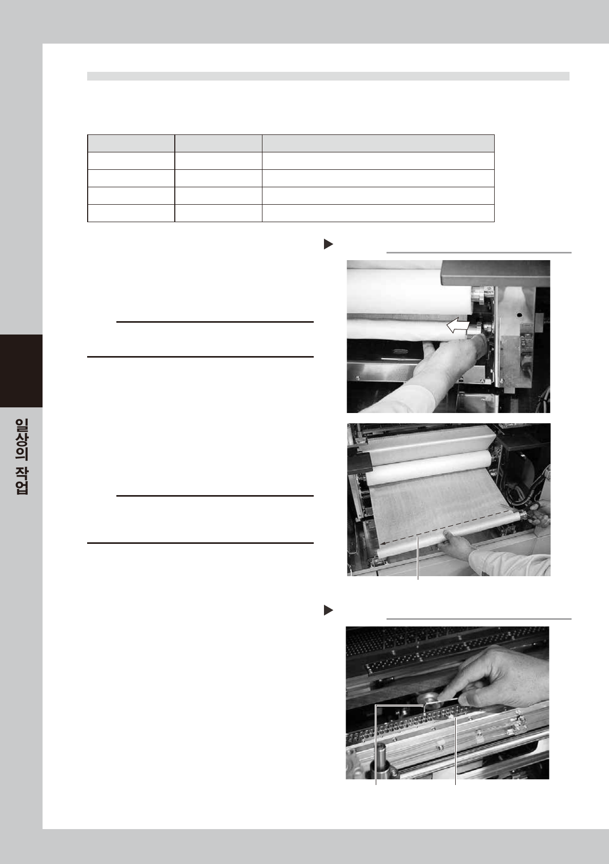 4-9 4 6 거즈 롤 을 가이드에 통과시킵니다 . 좌우의 평 행 을 유지 하 면서 , 우 측 그 림 과 같이 거 즈 롤을 가 이 드 에 통과 시켜 주십시 오 . 67 40 4-N 3-00 c 주의 거 즈 롤의 이 면 ( 뒷 면 ) 은 사 용 하지 마십시 오 . 7 새로 운 거즈 롤의 선단을 와인딩 축에 끼운 롤 심지에 고 정 시킵니다 . 거 즈 롤의 감김 이 원활하 게 되 도 록 접착 테이…