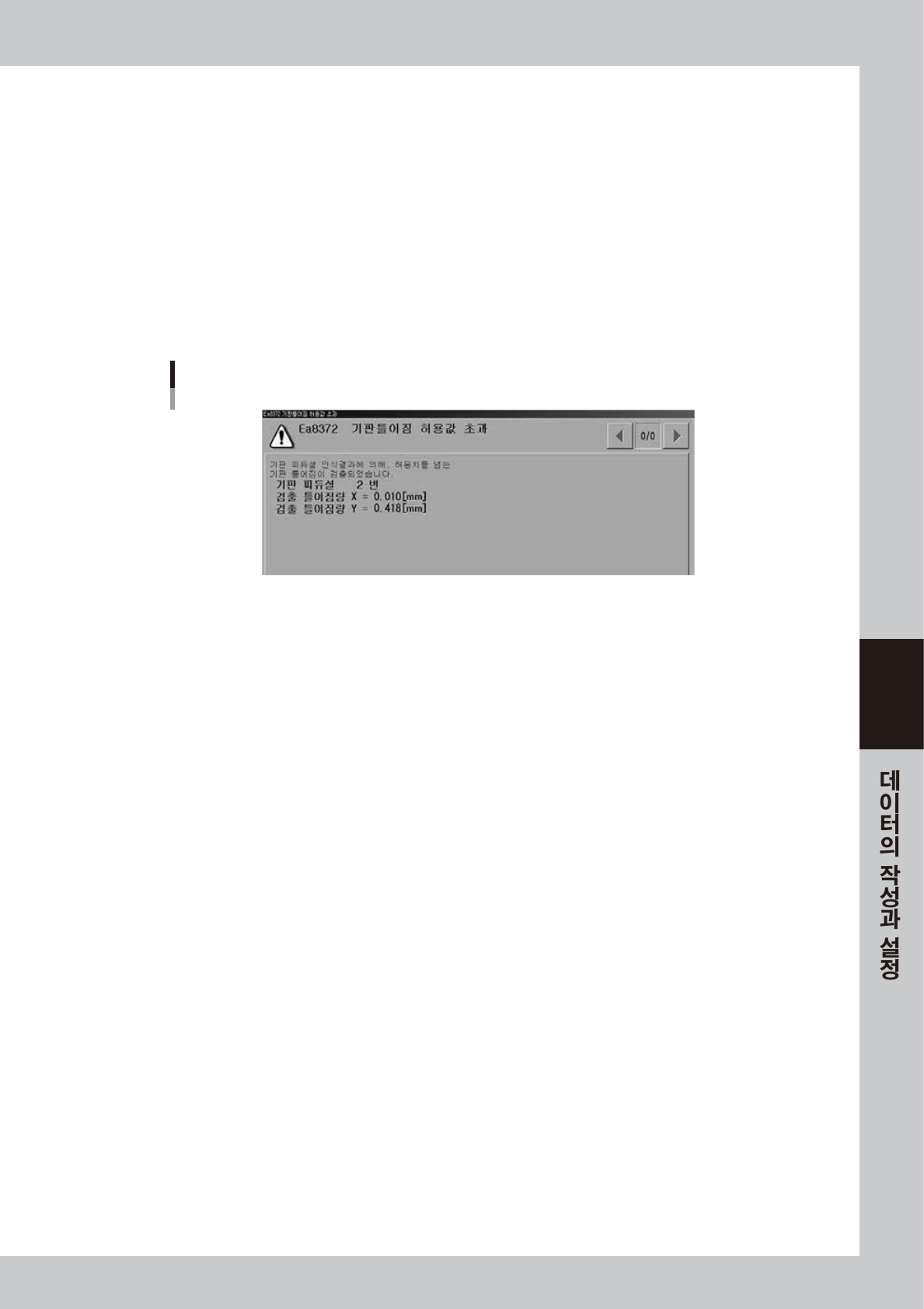 마크를 인식해서 얻은 변형 성분 계산치가 여기에서 설정한 허용치를 넘으면 에러 메시지가 표시되고 장비가 정지됩니다 .