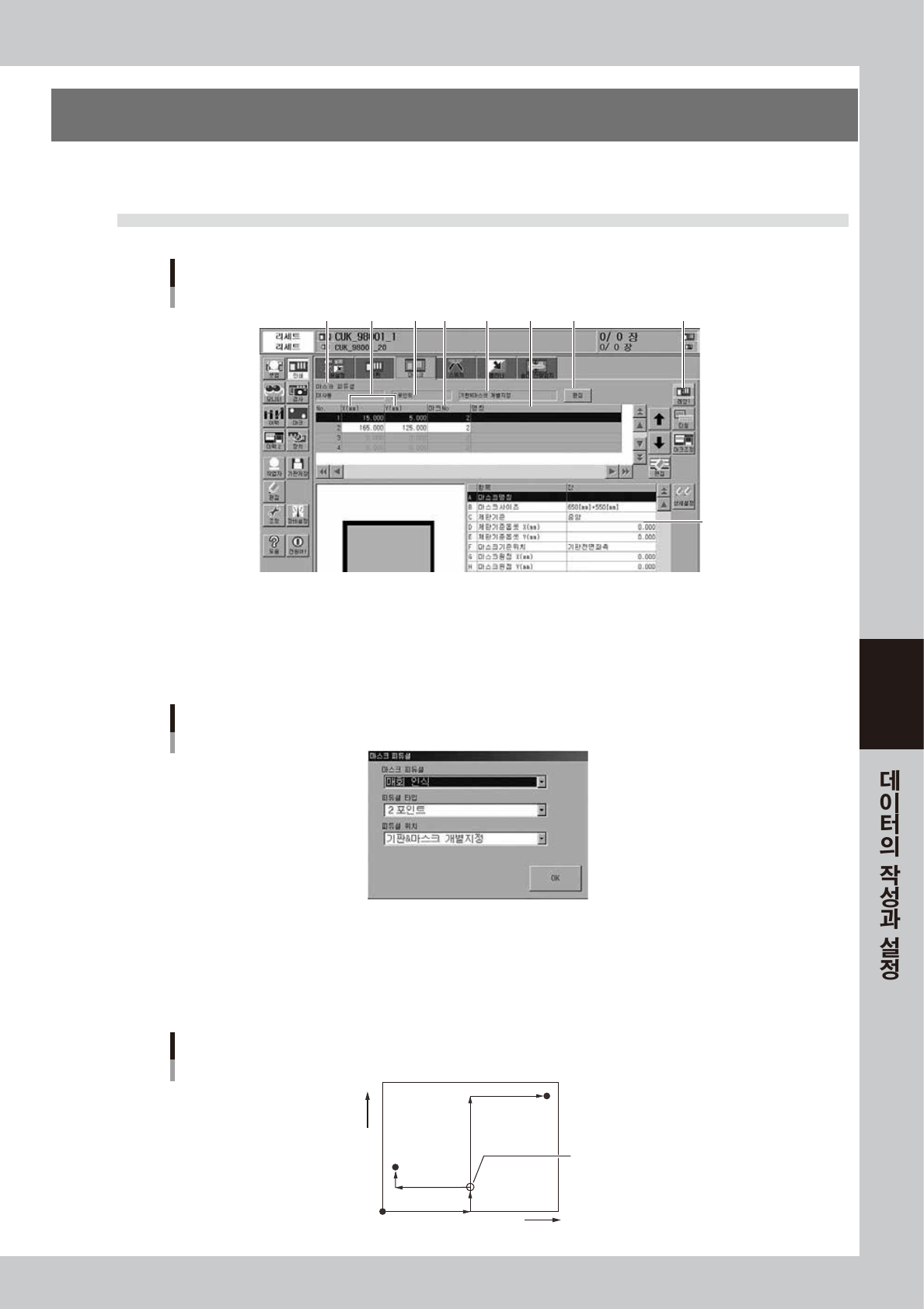 마스크 피듀셜 좌표축의 원점이 마스크 기준위치와 다를 경우 마스크 기준위치에서의 옵셋량을 설정합니다 .