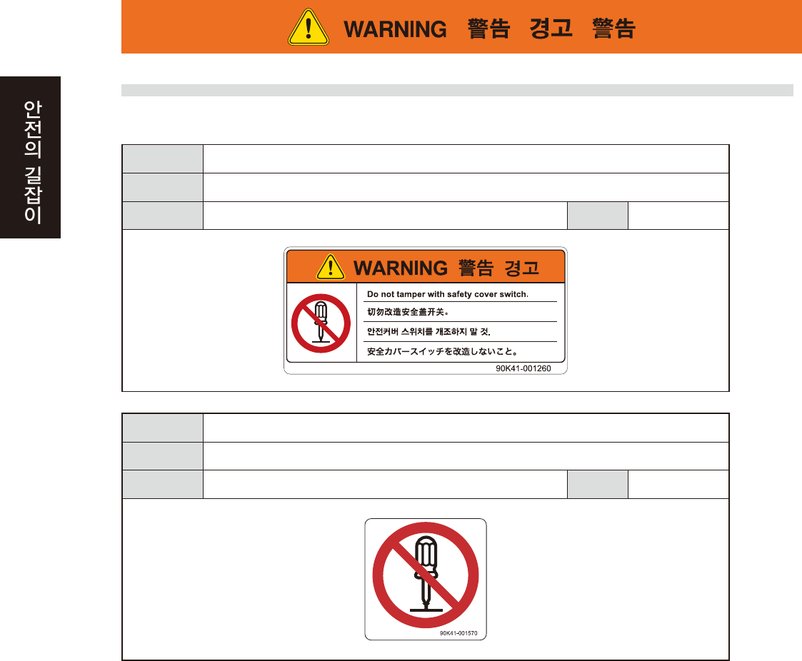xii 3 .2 경고 표 시 3.2. 1 커버의 취급 위험의 결과 장 비 의 가 동 부가 신체에 닿 아서 다 칠 우려가 있습니 다 . 위험의 회피 커버 스위치를 만 지거나 개 조 하지 말 것 . 커버 스위치가 해제된 상태에서 운전하지 말 것 . 대상 YS 시리즈의 모든 장비 , 트 레 이체인저 등 적용 단계 모든 경 우 위험의 결과 안전 구조의 결함 에 의해 예상치 못한 사고를 일 으 킬 가…