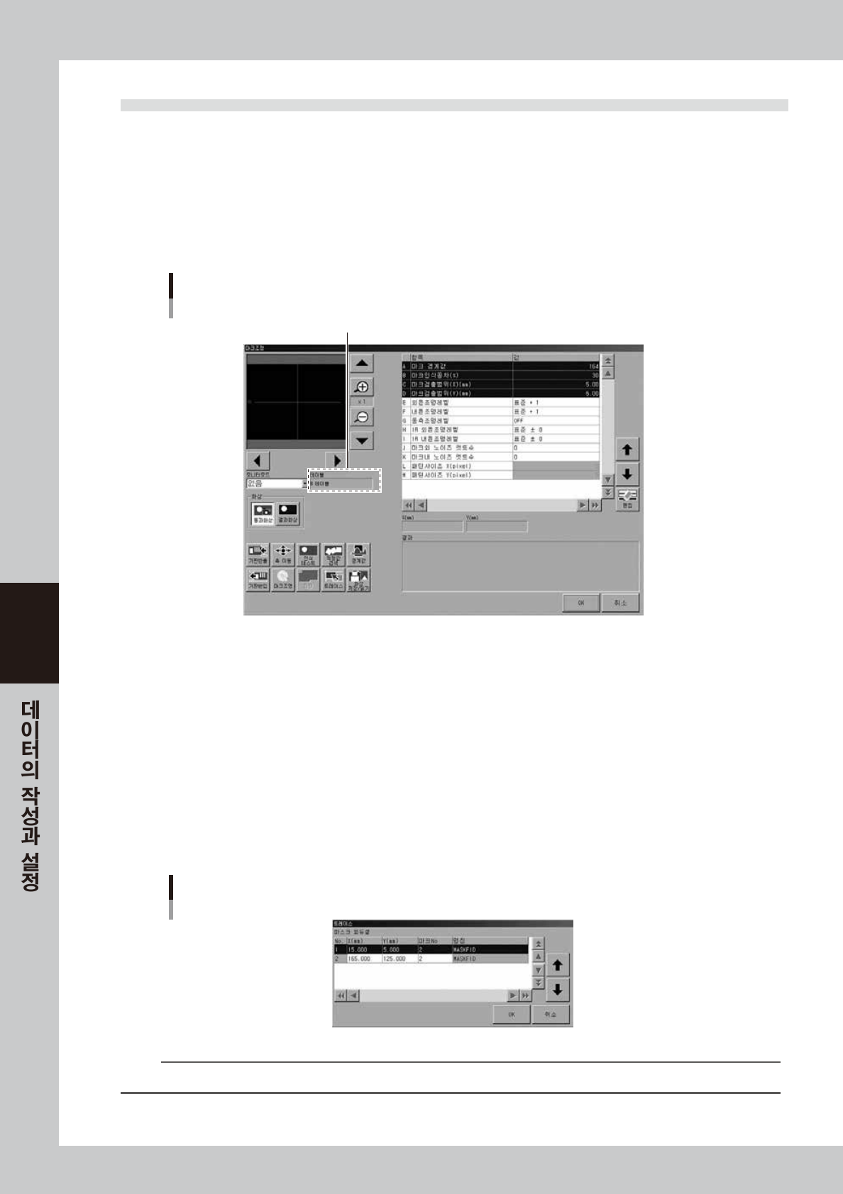 5-36 5 7. 5 보 조 조정을 실 행한다 등록 한 마 크의 설 정 치 가 적 절 한 지 확 인 하는 작업 입 니 다 . 미 설 정 파 라 미 터 에 대 해 서 는 인 식 테 스트 를 하 면 서 최적치를 구 합 니다 . 1 마크데이터를 선택합니다 . 마크화면 의 상부 리 스트중 확인 하 고 자 하 는 데 이 터 행 에 커서 를 맞춥 니 다 . 2 [ 마크 조정 ] 버튼 을 눌러 서 마크 …