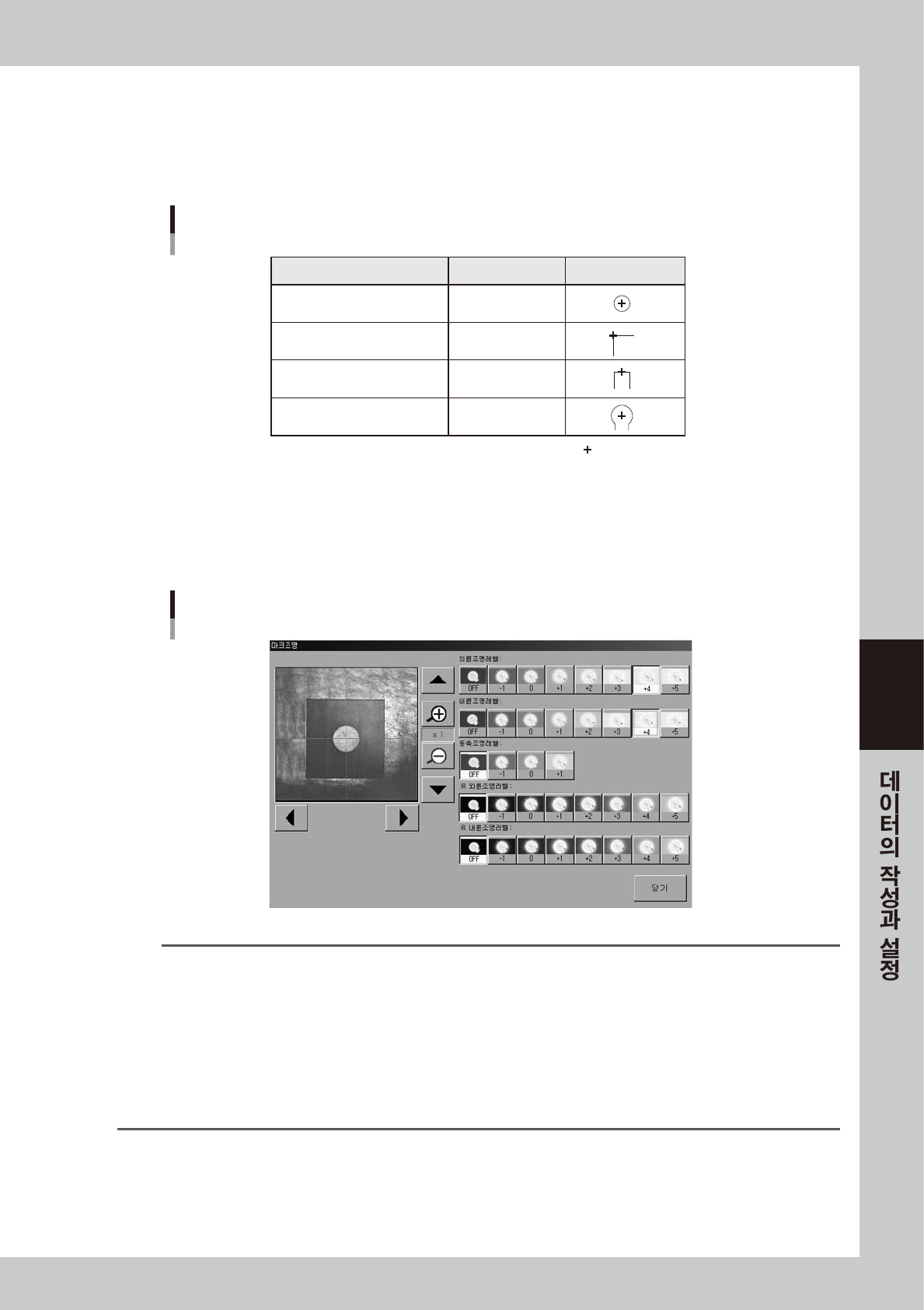 화면의 중앙커서와 마크가 아래의 표와 같은 관계로 되어있는지 확인해 주십시오 .