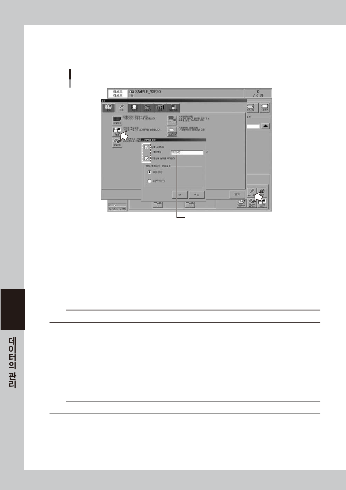 6-7 6 4 시스템백업 설정 화 면을 표 시 합니다 . 「셋 업 」화면에 서 유틸 리 티 내 의 [ 시 스템 백 업 ] 버 튼을 눌러 주십 시 오 . 5 백업을 시작 합 니다 . [ 백 업 ] 버튼 을 눌러서 , 백 업을 실행 해 주십 시 오 . • 미디어 폴더 가 선 택 되 어 있 지 않을 경우는 , 폴더선 택 대 화 창 이 표시 되 므로 , 저 장처의 폴더 를 선 택 하 고 실 행 해 …