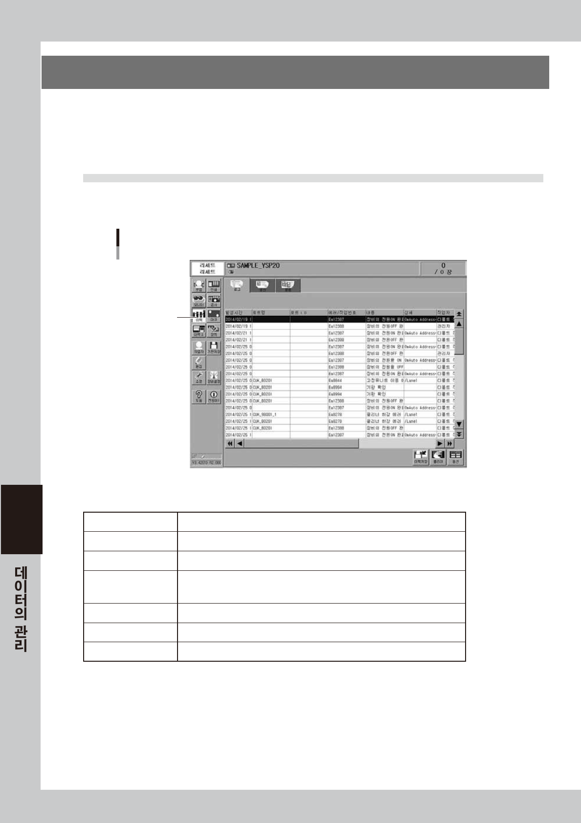 본 장비에서 발생한 에러나 각종 작업 이벤트를 표시합니다. 1건의 에러 또는 작업이 1행의 데이터로 되어