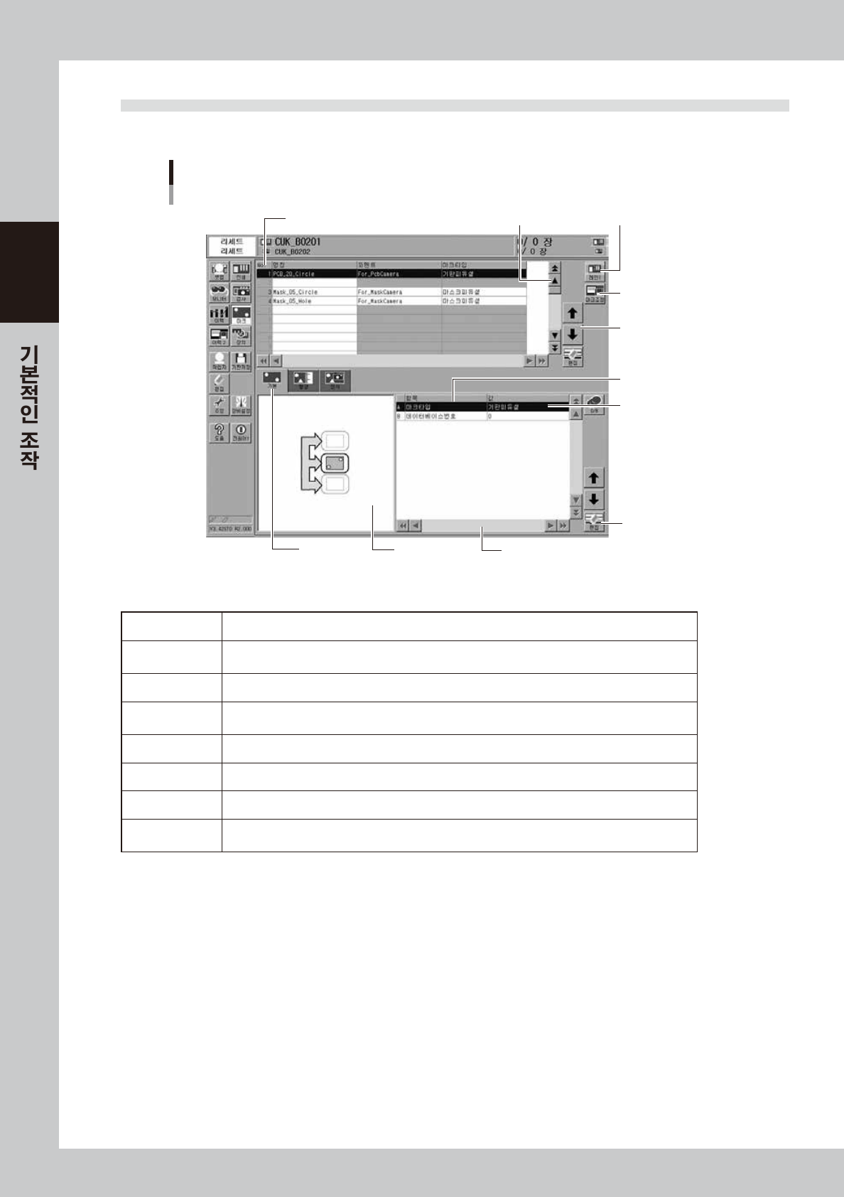행이동 버튼 데이터 No. 리스트와 파라미터 리스트내의 커서행을 상하로 이동시킵니다 .