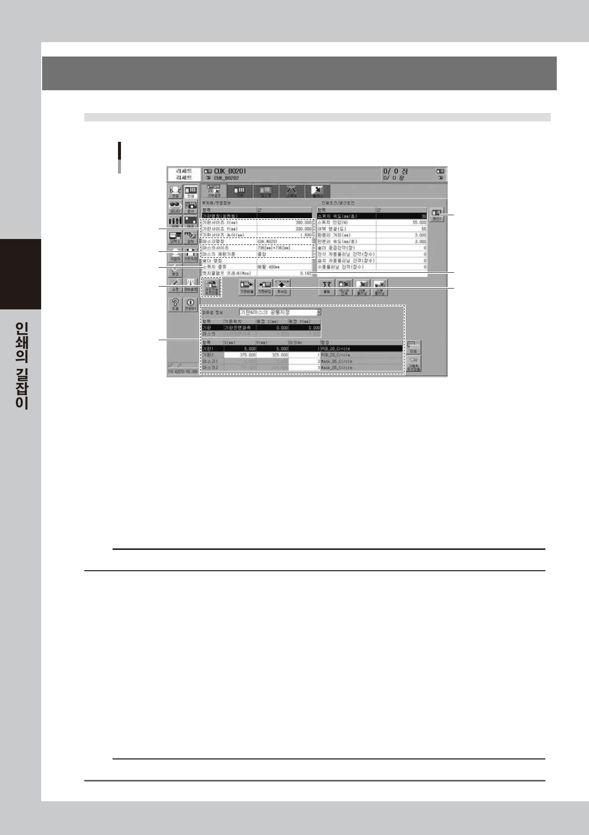 3-1 3 1 . 인 쇄조건 추 출 의 흐 름 양호 한 인 쇄 를 실행 하기 위한 조건 추출 ( 데 이 터 의 설정 ) 및 셋업 작 업 에 관해서 플 로 우 형 식으로 다 음 과 같 이 표 시합 니다 . • 조건 추출을 실행 하기 전 에 , 기 본적인 데이 터 의 입 력 및 셋업 작업이 완료되어 있어 야 합니 다 . • 조건 추출 로 인 한 파라미터 의 변경 결 과 는 , 솔더 / 마 스크 …