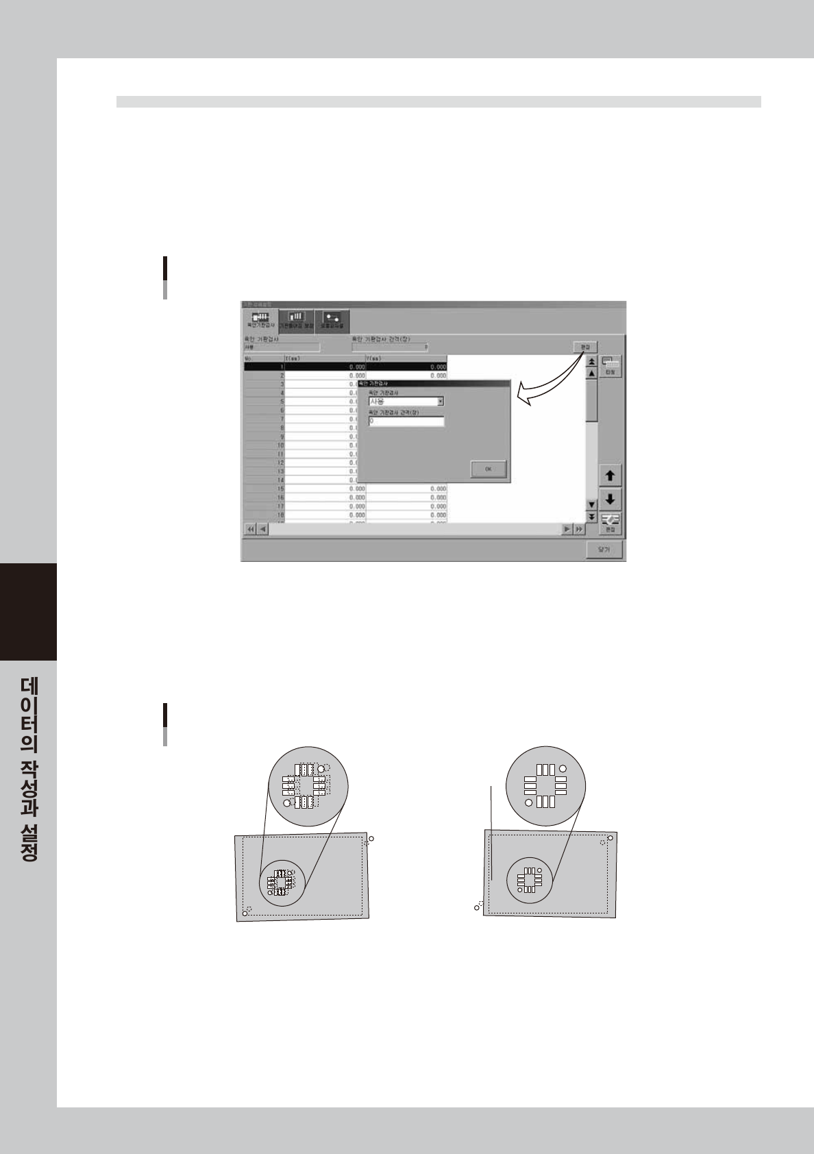 「육안 기판검사」탭 화면에서는 솔더인쇄 후 육안검사를 할 기판상의 좌표를 미리 입력할 수 있습니다 .( 본 장「9. 테스트