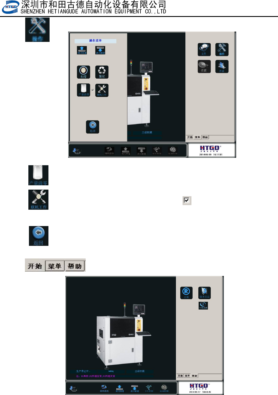 - 36 - 第四章 操作系统说明 13 : :界面切换按钮。单击该按钮进行生产界面与主界面的切换; 14 : :退出按钮。单击该按钮退出系统; 15 : : 开始按钮。 单击该点击该按钮后系统会执行 “判断运输导轨上有 PCB 板” 、以及 “提示是否调整运 输导轨的宽度” 等操作,依次点击是 或否后机器执行印 刷操作。 16 : :暂停按钮。此按钮只作为状态提示; 17 : :停止按钮。点击该按钮并确认后机器会停止生产动作; 4.2…